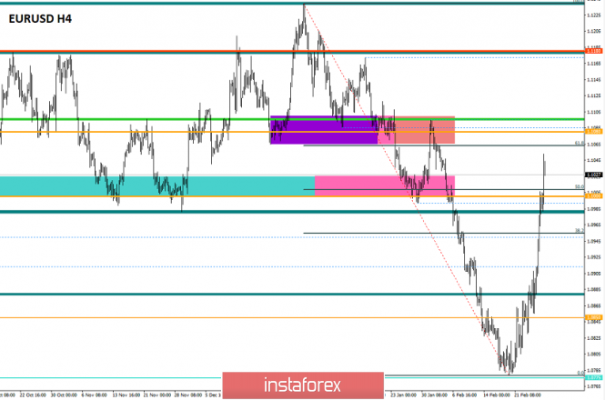 Торговые рекомендации по валютной паре EURUSD – перспективы дальнейшего движенияИнстаФорекс - Instaforex, 5 лет назад С точки зрения комплексного анализа мы видим крайне высокую активность, где инерционный ход никак не может завершиться, а теперь о деталях. Мечты продавцов рушатся вместе с неутолимым инерционным ходом, который не на шутку разошелся, вырабатывая больше половины всего нисходящего движения за февраль. Такого поворота в развития, откровенно говоря, не ждали, точки взаимодействия, где могли бы произойти замедления с отскоком, были пройдены без лишних усилий. Психологический уровень 1,1000, куда пришла котировка еще вчера, уже был пробит сегодня, если ссылаться на часовой график. Что получается, теория нисходящего развития оказалась провальной? Не стоит делать поспешных выводов, сейчас тщательно рассматриваются причины столь резкого роста, где сводят имеющееся поведение с обвалом фондового рынка США. Здесь есть о чем подумать, если переключиться на фондовый рынок, мы видим катастрофические цифры, так вот, индекс S&P 500, в корзину которого включено 500 избранных торгуемых на фондовых биржах США публичных компаний, за шесть дней обвалился на 13 процентов, потеряв 3,5 трлн долларов капитализации. В то время как индекс Dow Jones упал на 4,4%; Nasdaq -4,6%; доходность 10-летних казначейских облигаций США снизилась до 1,28%, доходность 30-летних облигаций американского казначейства снизилась до 1,78%. Все происходящее моментально стали сравнивать с Великой депрессией, а также с кризисом 2008 года. В данной ситуации интересно смотрится другой момент, до этого «колоссального» обвала мы имели настолько сильный рост относительно всех индексов, что словно все поголовно игнорировали возможный риск, вывод – обвал при малом шорохе. Теперь вернемся к нашим баранам, доллар теряет позиции с молниеносной скоростью, как раз, возможно, на фоне паники, развивающейся на фондовом рынке. Является ли это локальным явлением, вероятно, так и есть, но сейчас нам нужны подтверждения того, смогут ли медведи вернуться в изначальную фазу после столь сильного разгрома. В плане волатильности мы видим первое в этом году столь существенное ускорение 127 пунктов, которое превысило среднесуточное значение на 159%. На такой активности с легкостью может возникнуть синдром FOMO [Синдромом упущенной выгоды], который не принесет ничего хорошего теории нисходящего развития. Разбирая поминутно минувший день, мы видим отчетливый инерционный ход, который был задан условно в 00:00 часов и продлился до конца торгового дня. Является ли это движение признаком перегрева длинных позиций, безусловно да, если, конечно, нет синдрома FOMO. Как обсуждалась в предыдущем обзоре, многие трейдеры ждали разворота, ссылаясь на точку переменного сопротивления 1,0950, где располагался Fibo уровень 38,2, но восходящий ход сохранился. Рекомендация от четверга касательно возможного возобновления восходящего хода совпала, имея небольшой профит. [Позиции на покупку будут рассматриваться в случае фиксации цены выше чем 1,0960, с перспективой хода к 1,1000.] Рассматривая торговый график в общем плане [дневной период], мы видим возврат цены в район четырехмесячной продолговатой коррекции, где мучительно долго котировка виляла периодом ранее. Новостной фон минувшего дня имел в себе вторую предварительную оценку ВВП Соединенных Штат