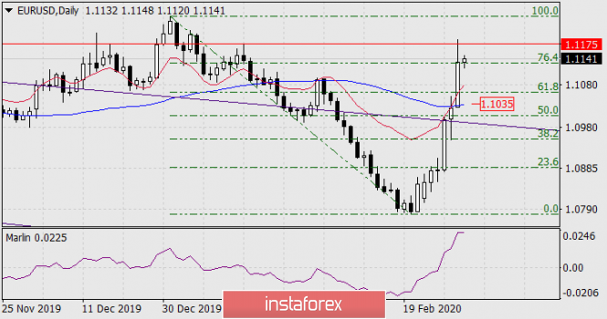 Итак, евро достиг целевой уровень 1.1175, осциллятор Марлин вошёл в зону перекупленности и показал первый признак разворота. Теперь ждём если не разворот цены вниз, то коррекцию, целью которой будет поддержка линии Крузенштерна на 1.1035.