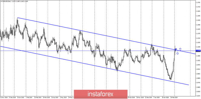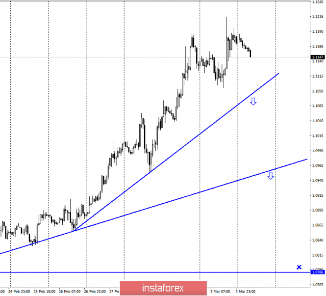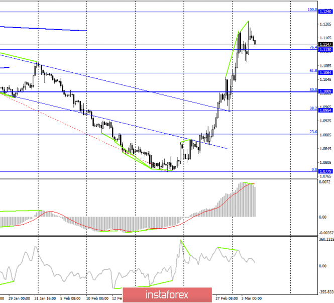 EUR/USD. 4 марта. Поход наверх завершен. Евровалюта готова к новому падениюИнстаФорекс - Instaforex, 5 лет назад EUR/USD – 1H. Добрый день, уважаемые трейдеры! На часовом графике пара EUR/USD продолжает процесс роста. Восходящая линия тренда уже вторая по счету продолжает сохранять «бычье» настроение у трейдеров. Каких-либо определенных целей на часовом графике нет. Тем не менее закрытие курса пары под линией тренда сработает в пользу американской валюты и некоторого падения котировок в направлении второй линии тренда. Часовой график наиболее хорошо показывает краткосрочное настроение трейдеров. EUR/USD – 4H. На 4-часовом графике после образования первой медвежьей дивергенции у индикатора CCI котировки пары выполнили некоторое падение, после чего возобновили процесс роста, не сумев выполнить закрепление под уровнем Фибо 76,4% - 1,1130. После этого была образована еще одна медвежья дивергенция у индикатора MACD, которая вновь сработала в пользу американской валюты и начался процесс возврата к уровню коррекции 76,4%. Таким образом, сразу две медвежьих дивергенции указывают на завершение восходящего тренда. На дневном графике также имеются веские причины ожидать падения пары. Таким образом, закрытие котировок под уровнем Фибо 76,4% существенно повысит вероятность дальнейшего падения пары евро-доллар в направлении уровней 61,8% - 1,1064 и 50,0% - 1,1009. EUR/USD – Daily. На дневном графике пара евро-доллар выполнила рост к верхней линии нисходящего трендового коридора и отработала целевой уровень 1,1150. Таким образом, сейчас высока вероятность отбой от этой линии коридора с разворотом в пользу доллара США и началом, возможно, длительного падения европейской валюты. В любом случае до закрепления курса пары над трендовым коридором ожидать трейдерам нового роста не приходится. EUR/USD – Weekly. Недельный график указывает на то, что потенциал роста у евровалюты есть. Однако это недельный график, то есть цели на нем могут отрабатываться в течение месяцев. Младшие графики говорят в пользу отката котировок вниз, после которого вполне возможно возобновление более глобального роста евровалюты. Обзор новостей: 3 марта в Евросоюзе вышел отчет по инфляции. Индекс потребительских цен сократился с 1,4% г/г до 1,2%. Таким образом, для евровалюты это плохие новости. Впрочем, особого расстройства трейдеры-медведи не испытали. Вчера также поступили новости от ФРС, которая на экстренном заседании понизила ключевую ставку рефинансирования на 0,5%. Если бы не мощные сопротивления около 1,1150 и предшествующий рост на 400 пунктов, евро имел бы шансы на еще больший рост. Календарь новостей для США и Евросоюза: Германия – Cоставной индекс деловой активности в производственном секторе (10-55 GMT +2). Германия – Индекс деловой активности в секторе услуг (10-55 GMT +2). ЕС – Cоставной индекс деловой активности в производственном секторе (11-00 GMT +2). ЕС – Индекс деловой активности в секторе услуг (11-00 GMT +2). ЕС - Изменение объема розничной торговли (12-00 GMT +2). США - Изменение числа занятых от ADP (15-15 GMT +2). США - Cоставной индекс деловой активности в производственном секторе (16-45 GMT +2). США - Индекс деловой активности в секторе услуг (16-45 GMT +2). США - Композитный индекс ISM для непроизводственной сферы (17-00 GMT +2). Сегодня в Америке и Евросоюзе будет достаточно большое количество экономических отчетов. Наибольшее внимание рекомендую обратить на комп
