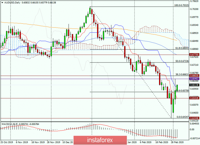 Анализ и прогноз по AUD/USD на 4 марта 2020 годаИнстаФорекс - Instaforex, 5 лет назад Весёлая неделька Доброго времени суток! На этой неделе австралийскому доллару было суждено пережить несколько важных событий, на которых стоит остановиться подробней. Вчера, 3 марта, на своём очередном заседании Резервный Банк Австралии (РБА) принял решение снизить основную процентную ставку с 0.75% до 0.5%. Для многих участников рынка такое решение стало неожиданным, так как в основном прогнозы предполагали, что РБА сохранит ставку на уровне 0.75% и пока не будет вносить изменений в свою денежно-кредитную политику. Однако вышло всё иначе, и думается, что не последнюю роль в таком решении австралийского регулятора сыграло распространение злосчастного коронавируса по всему миру. Число заболевших и погибших с каждым днём увеличивается. Туристический бизнес терпит колоссальные убытки, люди просто боятся выезжать в другие страны, особенно в те, где уже зарегистрированы случаи эпидемии. В Китае, который является крупнейшим торговым партнёром Австралии, закрыты некоторые заводы. Всё это создаёт дополнительные риски и увеличивает вероятность очередного глобального финансово-экономического кризиса. Австралийский Центробанк и так не отличался склонностью к ужесточению монетарной политики, а в текущих условиях решил действовать на опережение, как и ФРС, которая в экстренном порядке вчера вечером понизила основную процентную ставку сразу на 50 базисных пунктов. Сегодня в 03:30 (мск) были опубликованы данные по ВВП Австралии за 4 квартал. И в годовом, и в квартальном исчислениях показатели оказались сильнее прогнозов и составили 2.2% и 0.5% соответственно. Завтра Австралия опубликует сальдо торгового баланса, а в последний день торговой недели станут известны данные по розничным продажам. Впрочем, как представляется, наиболее важными и значимыми для инвесторов станут трудовые отчёты из США, время публикации которых, как обычно, состоится в 16:30 (мск). Полагаю, что именно это событие определит итоги закрытия текущей торговой пятидневки. Теперь давайте посмотрим, какая картина наблюдается на дневном графике aud/usd. Daily Это может показаться невероятным, но после снижения РБА основной процентной ставки австралийский доллар вырос. На рынке возможны различные сценарии, поэтому удивляться ничему не стоит. К тому и ФРС также понизила ставку, только уже вечером, в конце вчерашних торгов. После того как пара взлетела к 0.6646, восходящий импульс угас и котировка откатилась на 0.6583, где и завершила торги вторника. Линия Киджун индикатора Ишимоку определённо оказала сопротивление росту, и именно её в моменте написания данной статьи «австралиец» вновь пытается преодолеть. Если удастся пробить Киджун и закрыть торги выше, следующим ориентиром для быков по «оззи» станет ценовая зона 0.6646-0.6663, где вчерашние максимумы и пробитый уровень поддержки. Также здесь проходит уровень 38.2 фибо от снижения 0.7032-0.6434. На данный момент текущий рост является коррекционным, поэтому если в районе 0.6646-0.6663 появится медвежья свеча или свечи, это станет сигналом к продажам пары. Впрочем, пока не совсем понятно, как участники рынка будут относиться к американскому доллару после столь неожиданного и резкого снижения основной процентной ставки. Возможно, стоит не торопиться и понаблюдать, к тому же в пятницу нонф