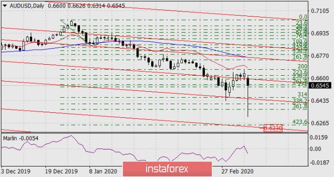 По австралийскому доллару произошёл сокрушительный обвал на 320 пунктов. Через несколько минут цена отыграла 80% падения. Но дальнейшей целью движения выступает всё же поддержка вложенной линии ценового канала в районе 0.6230.