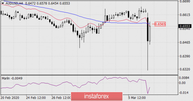 На четырёхчасовом графике индикаторная линия Крузенштерна теперь выступает в качестве сопротивления на уровне 0.6565. Выход цены над неё будет означать намерение «австралийца» закрыть утренний гэп. Но далее ожидаем вновь снижение цены к обозначенной цели 0.6230, только уже с меньшей скоростью.