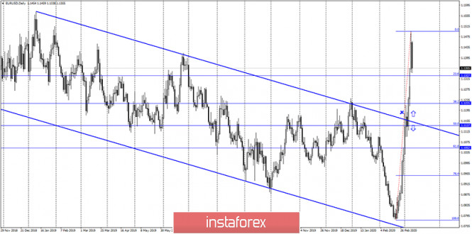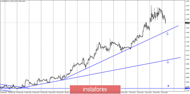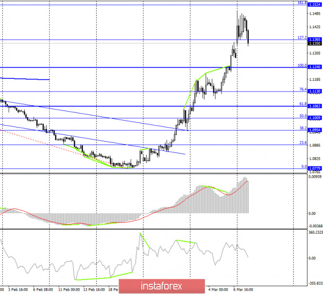 EUR/USD. 10 марта. Завершение up-тренда или небольшой откат? Потенциал падения - область 1,1137–1,1221ИнстаФорекс - Instaforex, 5 лет назад EUR/USD – 1H. Добрый день, уважаемые трейдеры! Пара EUR/USD в целом продолжает находиться в up-тренде. Вторая восходящая линия тренда, имеющая более высокую степень наклона, продолжает характеризовать настроение большинства трейдеров как «бычье». На текущий момент котировки пары выполнили разворот на часовом графике в пользу американской валюты и начали процесс падения в направлении второй линии тренда. Отбой курса пары от этой линии сработает в пользу евровалюты и возобновления роста котировок. Закрытие под ней даст долгожданный сигнал к продажам и позволит трейдерам рассчитывать на падение в направлении первой линии тренда. EUR/USD – 4H. На 4-часовом графике котировки пары евро-доллар также выполнили разворот в пользу американской валюты с закреплением под уровнем Фибо 127,2% - 1,1365. Я не уверен, что up-тренд можно считать завершенным на этом графике, так как пока откат очень мал. Тем не менее трейдеры могут сейчас рассчитывать на некоторое падение в направлении уровня коррекции 100,0% - 1,1240. Назревающих дивергенций 10 марта не наблюдается ни у одного индикатора. EUR/USD – Daily. На дневном графике пара евро-доллар после стремительного роста к уровню 1,1496 наконец-то может начать падение. Я предположил, что оно уже началось и построил сетку Фибоначчи, которая прогнозирует падение котировок в направлении уровней Фибо 38,2% - 1,1221 и 50,0% - 1,1137. Тем не менее столь сильный рост котировок, который наблюдался в последние дни, и то состояние, в котором сейчас находится рынок, вполне могут обратиться в новый рост котировок евровалюты. Таким образом, торговая идея с падением в область 1,1137 – 1,1221 всего лишь гипотеза. EUR/USD – Weekly. Недельный график указывает на то, что потенциал для роста у европейской валюты остается и ограничен уровнем 1,1600 (приблизительно) или верхней линией сужающегося треугольника. Пока что трейдеры-быки решили взять паузу (неизвестно надолго ли), таким образом, примерно 100 пунктов пара не дошла до целевого уровня. Цель сохраняет свою актуальность. Обзор новостей: 9 марта в календаре значился единственный отчет – в Германии по промышленному производству за январь. Были и другие отчеты в Германии, однако они были крайне слабыми. Производство в Германии выросло на 3,0% м/м и сократилось на 1,3% г/г, оказавшись лучше ожиданий трейдеров. Однако сейчас на рынке царит паника и явно не экономические отчеты движут трейдерами. Календарь новостей для США и Евросоюза: Евросоюз – Изменение объема ВВП (12-00 GMT +2). Сегодня единственный отчет дня – ВВП в ЕС за четвертый квартал. Однако сегодня я могу сделать тот же вывод, что и вчера. Вряд ли этот потенциально очень важный отчет будет всерьез рассмотрен трейдерами, которые остаются в состоянии паники, судя по силе движений. Отчет COT(Commitments of traders): Новый отчет Commitments of traders за неделю от 3 марта показал, во-первых, резкое сокращение количество Short-позиций среди группы «Non-commercial». Во-вторых, резкое увеличение и Long и Short-позиций среди группы «Commercial». В-третьих, заметно выросшее общее количество и Long и Short-позиций. Активность рынка растет, увеличивается общее количество покупок от крупных игроков, а хеджеры сейчас страхуются и от будущего роста евровалюты и от его падения. В части таблицы «Changes» еще лучше видно, что ко