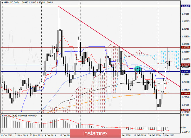 Анализ и прогноз по GBP/USD на 10 марта 2020 годаИнстаФорекс - Instaforex, 5 лет назад Приветствую, уважаемых коллег! В этой статье разберём техническую картину по паре фунт/доллар, а также обозначим наиболее важные события, которые до конца недельных торгов будут поступать из Великобритании и США. Начнём с макроэкономической статистики. В среду Великобритания предоставит отчёты по обрабатывающей промышленности, промышленному производству, а также данные по ВВП. Судя по экономическому календарю, это и единственный, и достаточно насыщенный британской статистикой день. Из США поступят данные по индексу потребительских цен, а на следующий день отчёты по ценам производителей. Более подробную информацию по этим и другим событиям можно найти в экономическом календаре. Теперь переходим к техническому анализу gbp/usd, и начнём с недельного таймфрейма. Weekly Как видим, прошлую торговую неделю пара завершила уверенным ростом, в результате которого на недельном графике появилась полная бычья свеча. Торги 2-6 марта закрылись на уровне 1.3043. Учитывая важный психологический и технический уровень 1.3000, это довольно неплохой результат для «британца». Теперь весьма любопытно сможет ли фунт стерлингов продолжить укрепление против доллара США? Торги этой недели по многим валютным парам открылись с ценовыми разрывами, причём не в пользу американской валюты. Не стала исключением и пара фунт/доллар, которая в понедельник поднималась до 1.3199, но удержаться вблизи значимого уровня 1.3200 не смогла и откатилась в район 1.3065, где и торгуется в моменте написания данной статьи. На мой взгляд, у быков по фунту просматриваются проблемы с дальнейшим подъёмом котировки. Впрочем, до конца недели ещё достаточно времени для изменения ситуации. Можно предположить, что среда станет самым важным днём для пары. По крайней мере к такому выводу можно прийти, глядя на события 11 марта в экономическом календаре. Если пара сможет вернуться к 1.3200 и подняться выше этой важной отметки, следующей целью станет сильная техническая область 1.3280-1.3320. Стоит учитывать, что на 1.3312 располагается 200 экспоненциальная скользящая средняя, которая с декабря прошлого года препятствует продвижению в северном направлении. Если текущая недельная свеча сохранит свою нынешнюю медвежью форму, появится сигнал для продаж. Пока же на недельном таймфрейме ничего хорошего для игроков на повышение курса не наблюдается. Daily В результате приличного роста пробита красная линия сопротивления 1.3513-1.3207. Кроме данной линии, пара прошла вверх 50 простую скользящую среднюю и линию Киджун индикатора Ишимоку. А вот с выходом вверх из облака Ишимоку наблюдаются проблемы. Вчерашние попытки выйти вверх из облака успехом не увенчались, даже несмотря на бычий ГЭП. В моменте завершения статьи пара не может пока даже войти в пределы облака, не говоря уже о выходе из него вверх. Сильное сопротивление можно обозначить в ценовой зоне 1.3100-1.3115, а выше вблизи уровня 1.3200. Поддержка сегодня была найдена на бывшем уровне сопротивления 1.3016, что технически вполне обосновано. Пока неясна судьба ещё одной отметки. В моменте завершения обзора пара торгуется вблизи 1.3068. Если сегодняшние торги завершаться выше данного уровня, это станет плюсом для быков по фунту. Вывод и рекомендации. Учитывая слабость доллара США, вызванную решением ФРС перейти 
