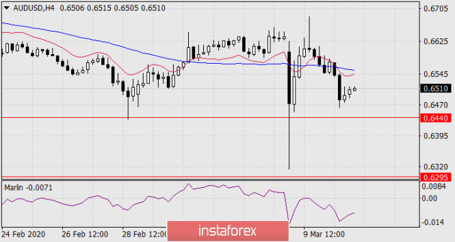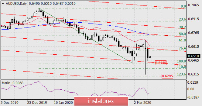 На графике дневного масштаба осциллятор Марлин в нисходящей позиции, цена стремится к поддержке вложенной линии ценового канала на отметке 0.6440, которая близка к минимуму 28 февраля. Преодоление поддержки открывает цель 0.6295 – уровень реакции Фибоначчи 123,6%.