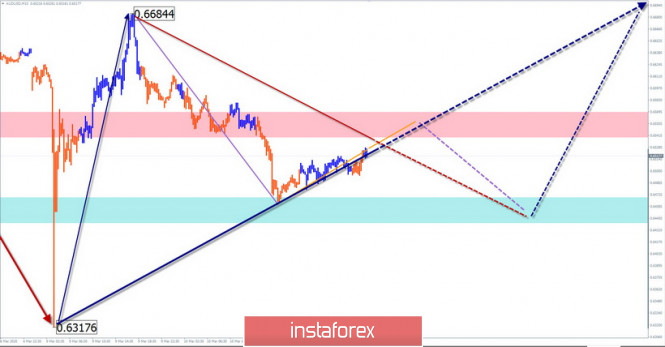 Упрощенный волновой анализ EUR/USD и AUD/USD на 11 мартаИнстаФорекс - Instaforex, 5 лет назад EUR/USD Анализ: Восходящая волна европейской валюты от 20 февраля находится на конце более крупной коррекционной модели дневного тайм-фрейма. Структура волны выглядит завершенной. Цена достигла зоны потенциального разворота. Начавшееся 9 марта снижение уже обладает разворотным потенциалом. Прогноз: Для смены направления краткосрочного тренда потребуется формирование разворотной конструкции. Текущее снижение может быть ее первой частью (А). Сегодня ожидается завершение начавшегося вчера подъема курса, формирование разворота и ход цены вниз. Дальняя зона поддержки показывает максимально возможный размах текущего участка. Зоны потенциального разворота Сопротивление: - 1.1370/1.1400 Поддержка: - 1.1290/1.1260 - 1.1200/1.1170 Рекомендации: Торговля на рынке европейской валюты сегодня возможна только в рамках интрадея. Основное внимание рекомендуется уделить продажам. Лот безопасней уменьшить. AUD/USD Анализ: Направление тренда австралийской валюты с начала текущего года задается нисходящей волной. В начале недели цена образовала вверх волну с высоким потенциалом, затем откатила вниз. Это может быть началом разворотной модели. Прогноз: В ближайшее время можно ждать смены направления междневного тренда. Ожидается как минимум коррекция предыдущего участка. Наиболее вероятных сценарием сегодняшних колебаний будет «боковик» между ближайшими встречными зонами. В конце дня более вероятен нисходящий вектор движения. Зоны потенциального разворота Сопротивление: - 0.6540/0.6570 Поддержка: - 0.6470/0.6440 Рекомендации: Сегодня торговля на рынке инструмента возможно в рамках внутри дневного стиля. Оптимальным будет воздержаться от торговли до полного завершения нисходящего отката. Далее в приоритете поиск сигналов покупки. Пояснения: В упрощенном волновом анализе (УВА) волны состоят из 3 частей (А-В-С). Анализируется последняя незавершенная волна. Сплошным фоном стрелок показана сформированная структура, пунктирным - ожидаемые движения. Внимание: Волновой алгоритм не учитывает продолжительность движений инструмента по времени! Материал предоставлен компанией InstaForex - www.instaforex.com |