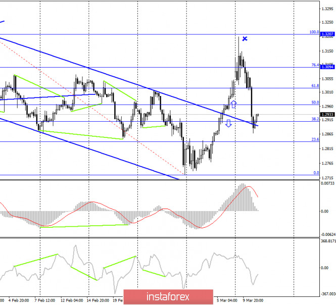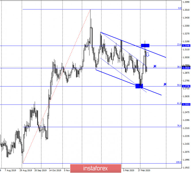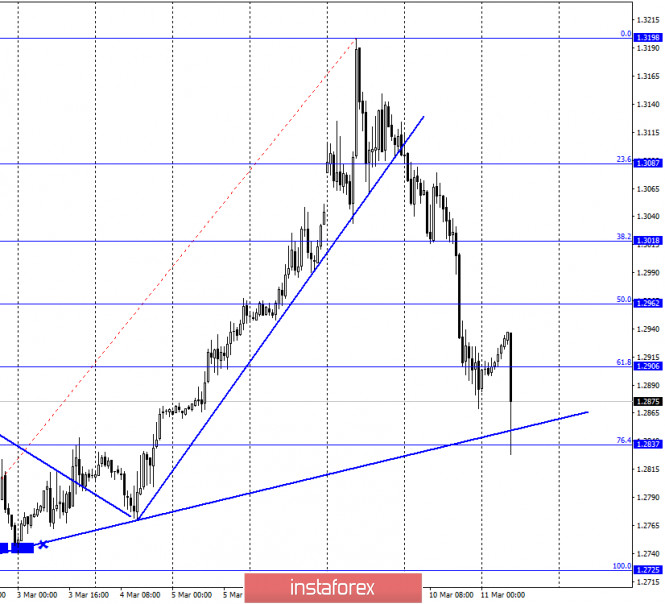 GBP/USD. 11 марта. Фунт стерлингов готов выполнить падение к уровню 1,2736?ИнстаФорекс - Instaforex, 5 лет назад GBP/USD – 1H. Добрый день, уважаемые трейдеры! На часовом графике котировки пары GBP/USD выполнили падение к коррекционному уровню 61,8% - 1,2906, а сегодня утром возобновилось бесконтрольное падение фунта и за 15 минут пара выполнила падение и к уровню Фибо 76,4% - 1,2837. Таким образом, все три цели по сигналу к продажам, которые я озвучивал вчера, отработаны. Что ждет британца в дальнейшем, вот в чем теперь заключается вопрос. Как мы все видим, никаких признаков снижения активности трейдеров нет. Таким образом, можно сделать вывод, что и паника на рынках остается, что чревато новыми сильными движения курса пары в любую сторону. GBP/USD – 4H. На 4-часовом графике пара GBP/USD также выполнила сильное падение, сначала к уровню коррекции 38,2% - 1,2909, а затем и к уровню 23,6% - 1,2840. Отбой котировок пары от последнего может сработать в пользу британской валюты и возобновления роста в направлении уровней Фибо 76,4% - 1,3094 и 100,0% - 1,3207. Однако я еще раз напоминаю трейдерам, что сейчас довольно рискованно работать в обе стороны. Сегодня котировки пары начали обвал с самого утра, хотя толком и новостей никаких на валютный рынок не поступало, и, например, евровалюта торгуется вполне спокойно. Но таковы нынешние реалии рынка форекс. Коронавирус продолжает вселять страх во всех крупных, средних и мелких инвесторов и трейдеров. GBP/USD – Daily. На дневном графике графическая картина остается наиболее интересной. После отбоя котировок от уровня Фибо 23,6% - 1,3146, а также верхней линии нисходящего трендового коридора, пара фунт-доллар выполнила разворот в пользу американского доллара и падение к уровню коррекции 38,2% - 1,2920. Таким образом, еще один целевой уровень, о котором я говорил вчера, отработан. Сегодня, исходя из этого графика и графической картины, сложившейся на нем, я ожидаю продолжения падения в направлении второй цели – уровня коррекции 50,0% - 1,2736. Британцу вполне по силам отработать его уже сегодня. Обзор новостей: Во вторник, 10 марта, не было ни одного отчета или новости, заслуживающей внимания трейдеров. Календарь новостей для США и Великобритании: Великобритания - Изменение объема ВВП(11-30 GMT). Великобритания - Изменение объема промышленного производства(11-30 GMT). США – Индекс потребительских цен (14-30 GMT +2). США – Индекс потребительских цен без учета цен на продукты питания и энергоносители (14-30 GMT +2). 11 марта важный экономические отчеты выйдут и в Британии, и в США. К сожалению, трейдеры по-прежнему не выказывают никакого желания торговать в соответствии с информационным фоном. К тому же в первые два дня недели никаких отчетов не выходило в обеих странах. Таким образом, трейдеры могут не обратить внимания на эти отчеты, а могут отработать их с лихвой. Отчет COT(Commitments of traders): Новый отчет COT за неделю от 3 марта показал все то же отсутствие изменений между общими объемами Short-позиций и Long-позиций. Таким образом, ничего не изменилось по сравнению с предыдущим отчетом. Рынки же сейчас остаются в состоянии паники, поэтому общие цифры всех контрактов по всем группам крупных игроков могут уже сильно отличаться от тех, что представлены в отчете. Тем не менее практически полное равенство Short и Long-позиций говорит в пользу того, что ни медведи, ни быки не обладают сейчас преимуществом. Прогноз по GBP/USD и рекомендац