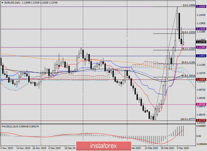 Обзор и техническая картина по EUR/USD на 12 марта 2020 годаИнстаФорекс - Instaforex, 5 лет назад Неутешительные предположения Меркель Здравствуйте, уважаемые коллеги! Тема распространения эпидемии COVID-19 по миру по-прежнему остаётся главной для рынков. В этой связи не остались незамеченными комментарии канцлера Германии Ангелы Меркель и президента Европейского Центрального Банка (ЕЦБ) Кристин Лагард. На своём вчерашнем выступлении в Берлине Ангела Меркель предположила, что от 60 до 70 процентов могут заразиться коронавирусом. Что и говорить, прогноз неутешительный. Напомню, что по состоянию на вчерашний день по подсчётам авторитетного информационного агентства число заражённых коронавирусом уже превышает 119 тысяч, а жертвами эпидемии стали 4 тысячи 296 человек. По мнению Ангелы Меркель, сейчас главной задачей является выиграть время, за которое должна быть найдена вакцина от COVID-19. Впрочем, никто не знает, сколько понадобится этого самого времени, а вирус не ждёт и продолжает распространяться по всему земному шару. Глава ЕЦБ Кристин Лагард выступила с инициативой выделять больше средств для противодействия эпидемии коронавируса. Также Лагард считает необходимым принятие стимулирующих мер для экономической стабильности. Кстати, сегодня станет известным решение ЕЦБ по процентной ставке, после чего глава этого ведомства проведёт традиционную пресс-конференцию. Напомню, что ранее в европейском Центробанке заявляли, что не пойдут по пути ФРС и не станут менять параметры своей денежно-кредитной политики. Другими словами, основная процентная ставка, которая находится на нулевом уровне, останется неизменной. А как же тогда понимать комментарии Кристин Лагард, что необходимы бюджетные меры для поддержки экономики региона? Пойдёт ли ЕЦБ по пути других ведущих мировых ЦБ, которые уже провели снижение ставок? Ответы на эти и другие вопросы мы узнаем сегодня, когда станет известно о решении ЕЦБ и состоится пресс-конференция Кристин Лагард. Почему-то вспомнился бывший президент ЕЦБ Марио Драги, пресс-конференции которого, как правило, давали повод для хороших ценовых импульсов. Полагаю, что европейскому регулятору придётся принимать решение о принятии стимулирующих мер, этого требует ситуация с распространением коронавируса и угрозой нового мирового экономического кризиса. Пока же поглядим, какова ситуация на дневном графике валютной пары евро/доллар. Daily На вчерашних торгах пара так и не смогла преодолеть отметку 1.1366, после чего снизилась и завершила торги среды на 1.1260. Интересно, но сегодня ситуация повторяется, по крайней мере на момент написания данной статьи. Пара уже поднималась до 1.1330, но удержаться там не смогла и опустилась к 1.1263, оставив вверху длинную тень. Сейчас евро/доллар торгуется вблизи линии Тенкан индикатора Ишимоку, которая всячески старается оказать котировке поддержку. Надо отметить, что сегодняшний день будет весьма важным для единой европейской валюты. На данный момент времени недельная свеча явно выглядит разворотной, то есть предвестницей последующего снижения. Полагаю, что у быков по евро сегодня едва ли не последний шанс исправить ситуацию. Для этого рынок должен позитивно воспринять решение ЕЦБ по ставке и комментарии главы ведомства Кристин Лагард. Скорее всего, европейский регулятор примет решение о см
