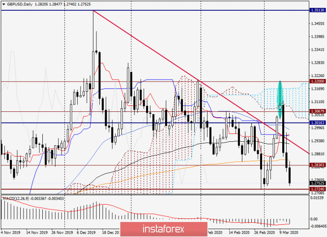 Анализ и прогноз по GBP/USD на 12 марта 2020 годаИнстаФорекс - Instaforex, 5 лет назад Здравствуйте, уважаемые трейдеры! Вчера Банк Англии в экстренном порядке решил снизить основную процентную ставку сразу на 50 базисных пунктов, до 0.25%. В принципе, участники рынка ожидали от английского Центробанка снижения ставки, и оно уже было заложено в цену фунта стерлингов. Распространение эпидемии коронавируса заставило Банк Англии не тянуть с решением о смягчении денежно-кредитной политики, а действовать быстрее и более решительно. Глава Банка Англии Марк Карни хоть и назвал последствия COVID-19, скорее всего, временными, но негативные влияния от коронавируса на экономику Соединённого Королевства обозначил как неопределённые. Также Карни заявил, что Банк Англии готов к последующему снижению ставки, уровень которой может быть немного выше нулевого. Меры по смягчению монетарной политики проводятся с целью защитить экономику и банковский сектор Великобритании. В такой ситуации даже тема Brexit ушла на задний план, так как главной задачей ведущих мировых ЦБ является защита и поддержка собственных экономик от последствий эпидемии коронавируса. Что же, давайте посмотрим на реакцию валютной пары фунт/доллар и на техническую картину, которая наблюдается по данному торговому инструменту. Daily После свечи, которая появилась на дневном графике 9 марта, стали отчётливо видны дальнейшие медвежьи перспективы gbp/usd. Именно так всё и происходит. Пара демонстрирует серьёзное снижение уже третий день кряду. Полагаю, это ещё далеко не предел. В случае пробоя уровня поддержки 1.2724 и закрытия торгов ниже этой отметки, шансы на продолжение медвежьего сценария по данной валютной паре значительно возрастут. В этом случае откроется дорога к уровням 1.2580 и 1.2515. Если же котировка опустится и закрепится под знаковым техническим и психологическим уровнем 1.2500, медведи полностью получат контроль над рынком. Несмотря на то что у инвесторов присутствует некоторое разочарование отсутствием у администрации Трампа чёткого плана по поддержанию экономики США от эпидемии коронавируса, доллар чувствует себя достаточно уверенно и укрепляется по широкому спектру рынка. По крайне мере, валютная пара фунт/доллар отчётливо демонстрирует склонность к медвежьему сценарию. Как уже отмечалось выше, свеча за 9 марта и ложный пробой красной линии сопротивления 1.3513-1.3207 - явное тому подтверждение. Н1 Несмотря на наличие бычьей дивергенции индикатора MACD, на часовом графике явно медвежий вид. Велика вероятность продолжения нисходящей динамики, а основной торговой идеей в данной ситуации выглядят продажи британской валюты. Главной задачей сейчас является нахождение приемлемых точек для открытия коротких позиций. На мой взгляд, продавать вблизи зоны поддержки 1.2738-1.2724 технически неправильно и достаточно рискованно. Несмотря на сильное медвежье давление, сохраняется вероятность коррекционного отката. При таком развитии событий можно рассматривать продажи пары gbp/usd после подъёма в сильную техническую зону 1.2800-1.2830. Более привлекательные цены для открытия коротких позиций можно поискать после роста в область 1.2880-1.2920. Впрочем, учитывая текущее сильное давление, такой вариант представляется менее вероятным. Ещё одной идеей для открытия продаж считаю откат к пробитой зоне поддержки 1.2724-1.2738. При 