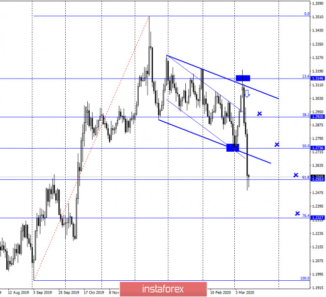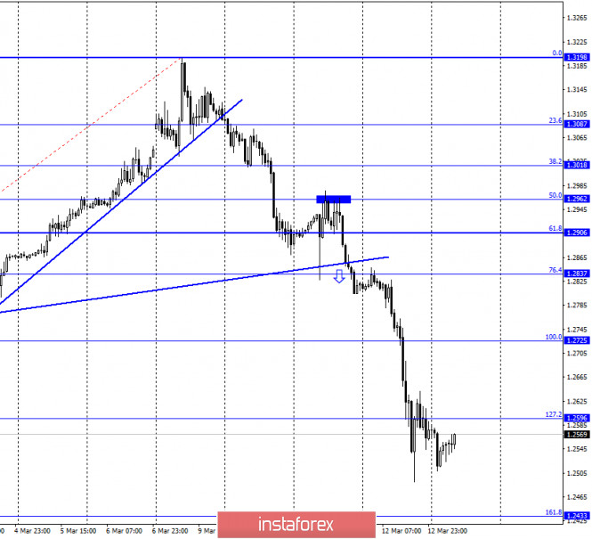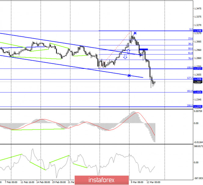 GBP/USD. 13 марта. Новый обвал фунта стерлингов. Коронавирус захватывает ВеликобританиюИнстаФорекс - Instaforex, 5 лет назад GBP/USD – 1H. Добрый день, уважаемые трейдеры! К большому моему сожалению, сейчас всеми мировыми рынками движут исключительно новости о распространении коронавируса, а также новости, связанные с мерами, предпринимаемыми ЦБ и правительствами, чтобы остановить распространение эпидемии и смягчить ее последствия. Еще неделю назад евро и фунт стерлингов росли как «на дрожжах», а теперь они валятся вниз изо дня в день. Таким образом, движения на валютном рынке остаются шоковыми. Вчера, 12 марта, котировки пары GBP/USD выполнили закрытие на часовом графике под линией тренда. Этот момент послужил сигналом к новым продажам. Однако вместо «простой» отработки ближайшего уровня коррекции, пара выполнила падение под уровень Фибо 127,2% - 1,2596. Таким образом, сохраняя высокую вероятность дальнейшего падения в направлении следующего уровня коррекции 161,8% - 1,2433. GBP/USD – 4H. На 4-часовом графике пара GBP/USD выполнила отбой от уровня Фибо 50,0% и возобновила процесс падения, причем такой сильный, что всю сетку Фибоначчи пришлось строить заново. На данный момент сетки совпадают на двух самых малых графиках. Трендовых коридоров, дивергенций или отбоев на 4-часовом графике сейчас не наблюдается. Данные идентичны показаниям часового графика. GBP/USD – Daily. На дневном графике графическая картина остается наиболее интересной. Вчера я также давал цели и для этого временного периода, но британец перевыполнил задачи и вместо падения к уровню коррекции 50,0% - 1,2736, осуществил «пике» сразу к уровню Фибо 61,8% - 1,2553. Таким образом, все целевые уровни, которые я давал в рамках сигнала об отбое уровня 23,6% и верхней линии нисходящего трендового коридора, отработаны. Более того, котировки пары фунт-доллар выполнили закрытие и под самим трендовым коридором. Отбой курса пары от уровня Фибо 61,8% сработает в пользу английской валюты и некоторого роста в направлении уровня коррекции 50,0% - 1,2736. Закрепление котировок под уровнем Фибо 61,8% повысит шансы на дальнейшее падение в направлении следующего коррекционного уровня 76,4% - 1,2327. Обзор новостей: В четверг, 12 марта, в календаре новостей Великобритании и США не было никаких важных отметок. Однако не прекращающийся поток новостей, касающийся коронавируса, продолжает будоражить валютный рынок, оставляет его в состоянии шока и паники. Вчера поступили сообщения из Великобритании, что количество зараженных может составлять уже 5-10 тысяч человек, а среди зараженных числится и замминистра здравоохранения страны. Опасность вируса заключается и в том, что прежде чем он будет идентифицирован, зараженный человек некоторое время не имеет симптомов, но при этом является носителем и разносчиком инфекции. Таким образом, по Великобритании вирус продолжит распространяться практически 100%. Календарь новостей для США и Великобритании: США – Индекс настроения потребителей от Университета Мичигана (16-00 GMT +2). Новостей в календаре на 13 число немного. Тем не менее новостные ленты будут продолжать пестреть новыми сообщениями о вирусе COVID-19. Отчет COT(Commitments of traders): Сегодня выйдет новый отчет COT и для пары фунт-доллар. Точнее, для британского фунта. Ключевым вопросом остается: нарушен ли будет полный баланс между Short и Long-позициями крупных игроков рынка? Все пос