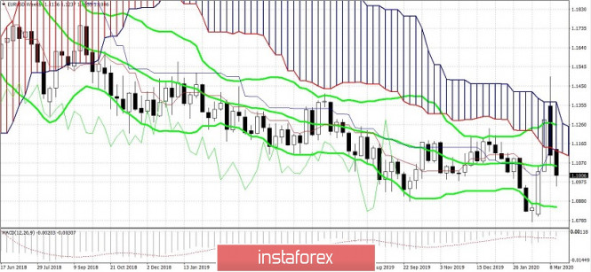 EUR/USD: слабая попытка коррекции и сила южного трендаИнстаФорекс - Instaforex, 5 лет назад Медведи пары евро-доллар не смогли закрепиться в районе девятой фигуры, хотя вчера цена находилась в этой ценовой области на протяжении всей американской сессии. Но в период азиатской сессии среды быки перехватили инициативу и попытались уйти выше стратегически-важной отметки 1,1050 (средняя линия индикатора Bollinger Bands, совпадающая с верхней границей облака Kumo на дневном графике). По мнению ряда валютных стратегов, если покупателям удастся сегодня обосноваться выше обозначенного таргета, то пара сформирует краткосрочное ценовое дно. По крайней мере сейчас стало очевидно, что ценовая область ниже 10-й фигуры достаточно тяжело поддаётся продавцам eur/usd, несмотря на общую гегемонию доллара. Данный ценовой отскок, который имеет все признаки коррекции, обусловлен несколькими факторами – как фундаментального, так и технического характера. Но в любом случае следует помнить, что пара по-прежнему находится в рамках южного тренда и будет находиться до тех пор, пока доллар будет бенефициаром панических настроений на рынке. Но прежде всего разберёмся, по какой причине пара евро-доллар неожиданно развернулась, несмотря на доминирование антирисковых настроений на финансовых рынках. Как ни странно, но макроэкономические релизы всё-таки смогли привлечь к себе внимание трейдеров. Хотя, как правило, в периоды подобных встрясок экономические отчёты уходят на второй-третий план, ожидая «своего часа». Но вчера мы стали свидетелями исключения из правил: и европейская, и американская валюты оказались под давлением «своих» отчётов. Вначале под прессинг разочаровывающих цифр попал евро: индексы ZEW Германии и еврозоны вышли не только в «красной зоне», но и обновили многолетние минимумы. Немецкий индекс рухнул до -49 пунктов при прогнозе снижения до -29 пунктов. Общеевропейский показатель продемонстрировал аналогичную динамику, снизившись почти до -50 пунктов при прогнозе спада до -23 пунктов. Индикаторы опустились до минимальных значений с 2010 года, отражая пессимизм европейской деловой среды. Чуть позже была опубликована и американская статистика – ничуть не лучше: общий показатель розничных продаж впервые с сентября прошлого года опустился в отрицательную область, достигнув -0,5% м/м. Без учёта продаж автомобилей индикатор продемонстрировал аналогичную динамику, рухнув до -0,4% (худший результат с декабря 2018 года). Существенно снизились также продажи и без учёта продаж авто и топлива (этот показатель упал до минимума февраля 2019 года). Вначале американская валюта проигнорировала данный релиз – индекс доллара стремительно шёл вверх на фоне снижения фондовых рынков и на волне общей паники. Но протестировав сотую фигуру, индекс доллара замедлил свой импульс. Градус накала на рынках несколько снизился после оптимистичных заявлений Дональда Трампа, который заявил о том, что в борьбе с коронавирусом «уже есть прогресс». Также он заверил американцев в том, что Белый дом окажет поддержку малому бизнесу и согласует с Сенатом дополнительные меры стимулирования. Как только на рынке немного ослабли антирисковые настроения, позиции доллара пошатнулись. Это важный момент, который свидетельствует о потенциальной уязвимости американской валюты. Как только истерия с коронавирус