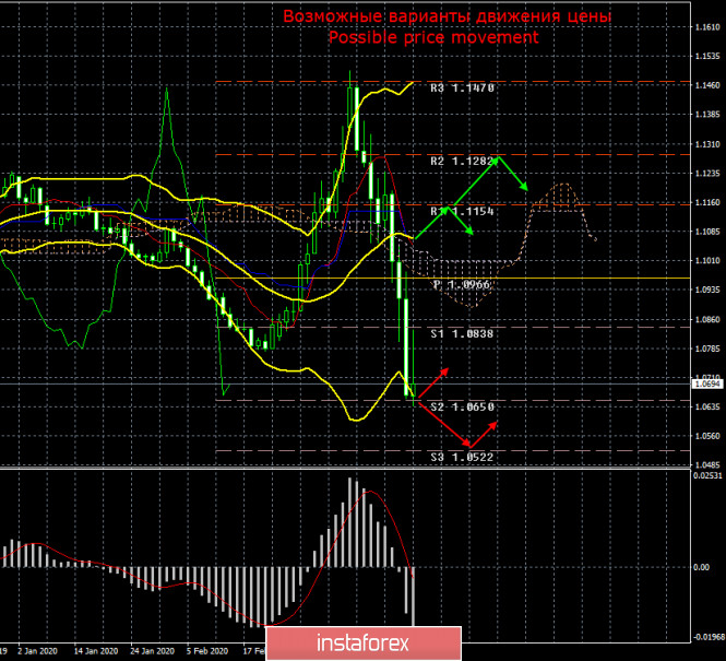 EUR/USD. Итоги недели. Эпидемия распространяется повышенными темпами в Италии, Испании, Германии и Франции.ИнстаФорекс - Instaforex, 5 лет назад 24-часовой таймфрейм За прошедшую торговую неделю валютная пара подешевела на 400 пунктов. И в текущих условиях эта цифра не кажется нижним рубежом потерь для европейской валюты. На 24-часовом графике котировки пары выполнили падение ко второму уровню поддержки 1,0650 и в пятницу не сумели преодолеть этот уровень. Таким образом, возникают некоторые надежды на начало коррекционного движения. Хотя можно сказать, что уже в пятницу большая их часть была развеяна, так как во второй половине дня медведи вновь начали атаковать евровалюту. Таким образом, нисходящее трендовое движение сохраняется. Высочайшая волатильность пары – сохраняется. И самое страшное, что сохраняются темпы распространения «коронавируса» по всей планете. На данный момент, по официальной информации, заражено уже более 300 000 человек по всему миру. Однако, мы же все прекрасно понимаем, что реальная цифра гораздо выше. Зараженными считаются уже 171 страна, а наибольшие очаги инфекции теперь находятся в Италии, Штатах, Испании, Германии, Иране, Франции. Таким образом, ситуация со всемирной эпидемией никак пока не разрешается. Соответственно, и паника не уходит ни с валютного рынка, ни с фондового, ни с сырьевого. С сырьевым рынком даже немного легче. Несмотря на падение спроса на нефть и очередную нефтяную войну, цена на энергоноситель номер один в мире не может долгое время находится ниже себестоимости или даже чуть выше нее. По словам некоторых экспертов в этой области, американской сланцевой нефти придется покинуть мировой рынок. Однако с нашей точки зрения, этого не произойдет и, скорее, все закончится очередным мировым конфликтом. В лучшем случае торговым. Вряд ли американские нефтяные компании просто закроют свое производство до лучших времен. Это не в интересах ни самих компаний, ни правительства США. Уже сейчас из-за океана слышаться угрозы в адрес ключевых виновников резкого снижения цен на нефть. Саудовская Аравия и Россия обвиняются в обвале рынка нефти, а саудиты еще и в демпинге цен. То есть в нечестной конкуренции. Таким образом мы считаем, что цены на нефть могут восстановится только, если будет разрешен конфликт между странами ОПЕК и Россией, и не будет инициирован новый. Для валютного рынка все эти подробности пока имеют весьма опосредованное значение. Мы по-прежнему не может сказать, что на обвалы европейских валют влияют какие-либо определенные факторы из Евросоюза или США. Таким образом, скорее всего, имеет место быть влияние всех факторов вместе взятых, либо же банальная паника, при которой участники рынка торгуют исходя из своих личных соображений и совершенно не следуют за рынком. К сожалению, темой номер один для всего мира остается именно «коронавирус». Хотя бы потому, что никакая макроэкономическая статистика сейчас не влияет на движение валютных пар. Не влияют также и действия центральных банков и правительств. Трейдеры остаются в состоянии паники, так как эпидемия оказывает сильнейшее влияние на все сферы деятельности практически по всему миру. В то время, как Штаты вышли на третье место в мире по числу зараженных «китайским вирусом», Дональд Трамп продолжает раздавать обещания по скорой победе над эпидемией