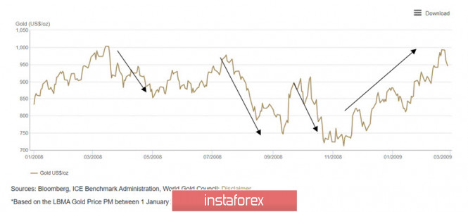 Золото – перспективы на фоне коронавируса COVID-19ИнстаФорекс - Instaforex, 5 лет назад Здравствуйте, уважаемые коллеги. Эпидемия коронавируса COVID-19 стремительно уничтожает мировую экономику, центральные банки и правительства различных стран принимают экстренные меры в попытках спасти то, что от нее осталось. Глобальный маржинкол привел к обвалу стоимости активов по всему миру. К сожалению, не удалось избежать негативных последствий и цене золота, которая в течение марта пережила стремительный взлет, затем падение, после чего опять выросла и к моменту написания этих строк котируется возле отметки 1600 долларов за тройскую унцию. Так почему упало золото и какие у него перспективы? Давайте попробуем разобраться. Говоря о перспективах золота или любого другого актива, нам необходимо понимать примерный временной горизонт нашей сделки или инвестиции, в противном случае мы можем столкнуться с ситуацией, когда на одном временном отрезке актив будет снижаться в цене, а на другом расти. Повышенная волатильность увеличивает неопределенность трендов, однако рынок есть рынок, и прежде чем перейти к рассмотрению краткосрочных позиций, разберем инвестиционные перспективы золота и выявим причины снижения цены, которые мы наблюдали в середине марта. В преддверии кризиса прошлого десятилетия золото также испытывало несколько периодов довольно существенного падения. Так, например, в марте-мае, в июле-сентябре и октябре-ноябре 2008 года цена золота образовала три цикла снижения, в результате которых она снизилась от $1000 до $700, и только затем золото начало цикл повышения, который завершился ростом к отметке $1900 в 2011 году (рис.1). Рис.1: Поведение цены золота в преддверии кризиса 2008-2009 года Тогда снижение цены было обусловлено политикой количественного сжатия, проводимой ФРС США перед началом острой фазы финансового кризиса, вызванного пузырем ипотечного строительства в США. Центробанк изымал ликвидность с рынка, что в условиях снижения цены активов приводило к необходимости пополнить недостаток маржи или ликвидировать позицию. В последствие такая политика была признана ошибочной, однако в этот раз ФРС заранее увеличивал ликвидность на рынках, но этого было явно недостаточно в условиях, когда фондовые рынки росли на протяжении десяти лет, подогреваемые программами количественного смягчения, проводимыми центральными банками по всему миру. Традиционно золото является активом-убежищем, но в периоды сильного сжатия ликвидности трейдеры вынуждены выходить из активов, в том числе из золота. Это, казалось бы, снижает его защитные функции, но даже в этом случае золото остается отличным стабилизатором рыночных рисков. Так, например, цена золота в иенах снизилась на 1.5%, в то время как цены японских акций упали на 29%. Цена золота в евро выросла на 2.2%, в то время как европейские индексы снизились на 36%. В марте цена золота в рублях выросла на 21%, при том что российские акции в среднем снизились на 13%. Кризис ликвидности в евро, иенах и долларах привёл к тому, что валютный рынок бросало то вверх, то вниз, а вместе с ним кидало и цену золота, которая к 25 марта вновь превысила отметку 1600 долларов за тройскую унцию. Если рассматривать краткосрочные перспективы драгоценного металла на часовом тайме, то выглядят они следующим образом: - золото консолидируется на вершин