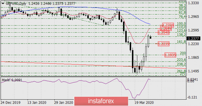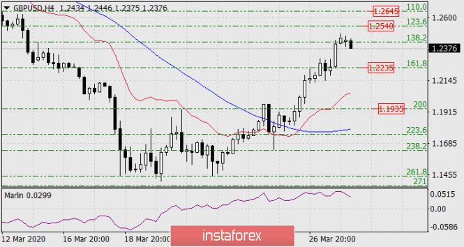 На четырёхчасовом графике сигнальная линия осциллятора Марлин с заметным наклоном разворачивается вниз, вероятно, понижающийся сценарий, как коррекция от роста с 20 марта, становится основным. Минимум коррекции видится на уровне Фибоначчи по цене 1.2235, закрепление под уровнем открывает перспективу углубления до 1.1935 по уровню Фибоначчи 200,0%, что также будет составлять 50% от всего роста с 20-го марта.