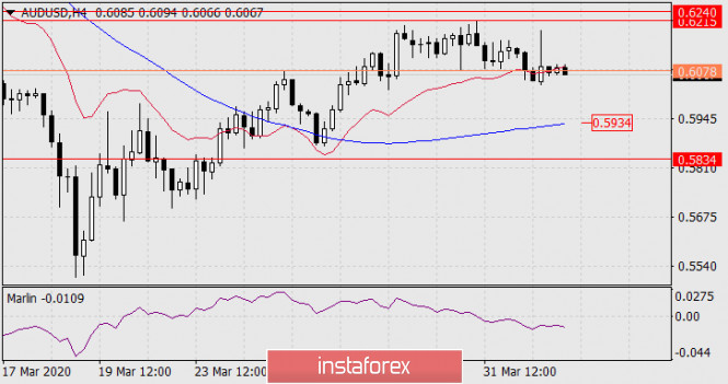 На графике Н4 цена находится прямо на линии баланса, слегка под ней. Сигнальная линия осциллятора Марлин закрепилась в зоне понижающейся тенденции. Промежуточной целью на пути к 0.5834 является линия Крузенштерна на цене 0.5934.