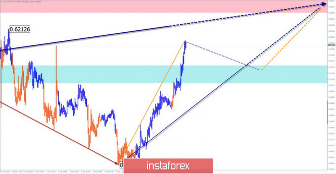Упрощенный волновой анализ EUR/USD, AUD/USD, GBP/JPY на 7 апреляИнстаФорекс - Instaforex, 5 лет назад EUR/USD Анализ: С 20 марта на графике основной пары евро развивается восходящая волна. С конца марта цена корректируется. Котировки сейчас находятся вблизи верхней границы предварительной целевой зоны. Сигналов разворотов на графике пока не наблюдается. Прогноз: На ближайших торговых сессиях ожидается завершение восходящего настроя движения, формирование разворота и последующее снижение цены в район расчетной поддержки. Перед завершением всей коррекции не исключен кратковременный прокол ее нижней границы. Зоны потенциального разворота Сопротивление: - 1.0870/1.0900 Поддержка: - 1.0800/1.0770 Рекомендации: До появления четких сигналов разворота покупки евро бесперспективны. В районе расчетного сопротивления рекомендуется отслеживать сигналы для продажи пары. AUD/USD Анализ: Восходящая волна австралийского доллара от 19 марта перешла на масштаб таймфрейма Н4. В структуре волны прослеживается четкий зигзаг (А-В). С 3 апреля старт вверх стартовала заключительная часть (С). Прогноз: Сегодня ожидается общий восходящий настрой ценового движения. В первой половине дня возможно кратковременное снижение, не далее зоны поддержки. Зона сопротивления показывает ожидаемую верхнюю границу дневного хода пары. Зоны потенциального разворота Сопротивление: - 0.6240/0.6270 Поддержка: - 0.6150/0.6120 Рекомендации: Продажи австралийской пары сегодня малоперспективны. Оптимальной тактикой будет дождаться завершения отката вниз и в зоне поддержки отслеживать точки для входа в длинные позиции. Пояснения: В упрощенном волновом анализе (УВА) волны состоят из 3 частей (А-В-С). Анализируется последняя незавершенная волна. Сплошным фоном стрелок показана сформированная структура, пунктирным - ожидаемые движения. Внимание: Волновой алгоритм не учитывает продолжительность движений инструмента по времени! Материал предоставлен компанией InstaForex - www.instaforex.com |