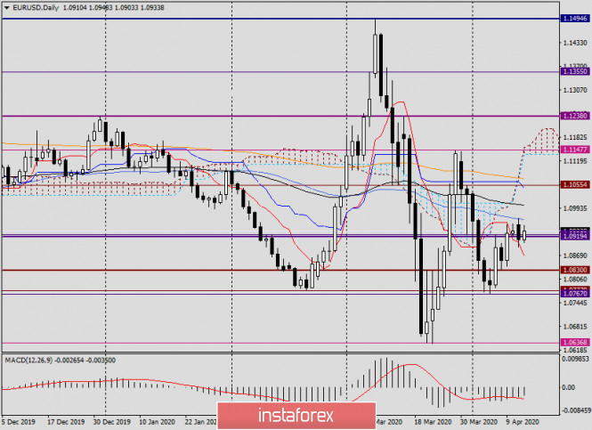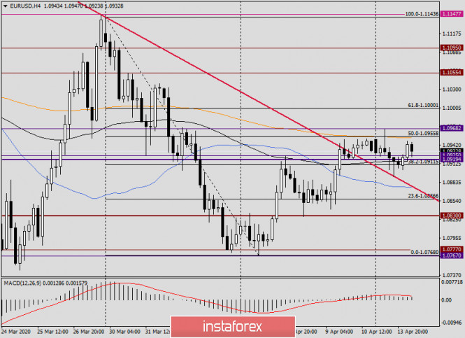 Анализ и прогноз по EUR/USD на 14 апреля 2020 годаИнстаФорекс - Instaforex, 5 лет назад Здравствуйте, уважаемые трейдеры! В последнее время рынок достаточно непредсказуем, в том плане, что фундаментальные факторы зачастую остаются без внимания инвесторов. При этом остаются без должной реакции не только макроэкономические отчёты, но и те меры, которые предпринимают ведущие мировые Центробанки для смягчения негативных экономических последствий, вызванных вспышкой COVID-19. По сути, в текущей ситуации особенно важную роль в движениях валютных пар играют технические факторы, которым в данном обзоре будет уделено большее значение. Однако сначала коротко по тематике коронавируса. Европу по-прежнему лихорадит от пандемии. Сообщения о меньшем количестве летальных исходов в ряде наиболее инфицированных стран не находят своего подтверждения, так как уже на следующий день ситуация вновь ухудшается и суточная смертность возрастает. Тем не менее ситуация в странах еврозоны складывается по-разному. Если французский президент Макрон подписал указ о продлении строгого карантина до 11 мая, то в Италии, где ситуация ещё далека от стабильного улучшения, принимается решение о некотором послаблении карантина. В первую очередь, это касается магазинов, чей ассортимент составляют канцелярские принадлежности и товары для новорожденных. Если перейти к разбору главной валютной пары рынка Forex и начать с событий дня сегодняшнего, то из США в 15:30 (мск) поступят отчёты по индексу импортных цен, а немного позднее состоятся выступления членов Комитета по открытому рынку (FOMC) Булларда и Эванса. Daily Вчерашняя идея покупать пару на снижении в ценовую зону 1.0920-1.0900 нашла своё подтверждение. По итогам торгов понедельника минимальные значения были показаны на 1.0893, а завершилась сессия на отметке 1.0912. Сегодня евро/доллар укрепляется, и на момент написания данного обзора торги ведутся вблизи 1.0932. По-прежнему серьёзное сопротивление попыткам роста оказывает 50 простая скользящая средняя, которая проходит на 1.0963. Впрочем, надо отметить, что на данный момент 50 МА ещё не была повторно протестирована на пробой, а такую вероятность исключать, думаю, не стоит. Более того, рискну предположить, что в случае переписи вчерашних максимумов 1.0967, подъём может продолжиться к 89 экспоненте, пролегающей на уровне 1.1002. Учитывая важность и значимость психологического уровня 1.1000, многое в дальнейшем направлении котировки будет зависеть от цены закрытия сегодняшних торгов относительно этой знаковой отметки. Если евробыкам удастся завершить сегодняшнюю сессию выше 1.1000, их следующей целью может стать район 1.1047-1.1055, где находятся линия Киджун индикатора Ишимоку и сильный технический уровень 1.1055. Если пара не сможет возобновить подъём и вернётся к вчерашней нисходящей динамике, после обновления минимумов понедельника евро/доллар рискует опуститься в район 1.0870-1.0830, где проходит линия Тенкан и минимальные значения торгов 8-9 апреля. Более дальней целью медведей по eur/usd станет сильная зона поддержки 1.0777-1.0767. Н4 На этом таймфрейме видим, что с трудом пара сумела преодолеть красную линию сопротивления 1.1484-1.1143. Котировка закрепилась выше данной линии, и вчера к ней был сделан откат и дана возможность открыть длинные позиции. А вот 200 экспоненциальную скользящую среднюю пройти вверх пока никак не удаё
