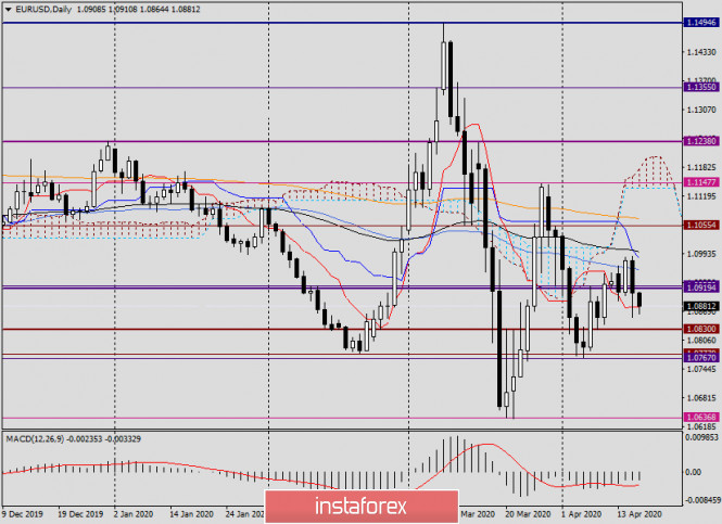 Обзор и торговые идет по EUR/USD на 16 апреля 2020 годаИнстаФорекс - Instaforex, 5 лет назад Приветствую, уважаемые коллеги! Сегодняшний обзор по главной валютной паре рынка Forex начну с американских макроэкономических отчётов, которые были опубликованы вчера. Индекс состояния рынка жилья от NAHB в марте продемонстрировал резкое падение, подобные масштабы в последний раз наблюдались в 2012 году. Хуже прогнозов вышли и данные по розничным продажам, использованию мощностей и промышленному производству. Все цифры в экономическом календаре. Можно не сомневаться, что это последствия разгулявшейся в США пандемии COVID-19. Также могу предположить, что состояние американской экономики из-за негативного влияния нового типа коронавируса будет только ухудшаться. Тем более что пик эпидемии в США, по оценкам большинства специалистов, ещё не пройден. Хотя Дональд Трамп считает иначе. Здесь надо отметить, что у 45-го президента Соединённых Штатов всегда своя и, по большому счёту, не совсем адекватная и корректная точка зрения. Чего стоит только его противоборство со Всемирной организацией здравоохранения (ВОЗ). Если кто не в курсе, то в последнее время США вовсю обвиняют в распространении коронавируса Китай, где и был дан старт COVID-19 по планете Земля. Учитывая данный фактор, коронавирус вполне можно называть китайским, что Трамп и сделал, вызвав тем самым недовольство и возмущение в Пекине. Дональд Трамп считает, что Китай и ВОЗ недооценили, или попросту проморгали, развитие ситуации с коронавирусом. Оказывается, Трамп давно предлагал запретить поездки в Китай, однако ВОЗ его ослушалась, и теперь американский лидер не желает, чтобы США платили взносы в бюджет Всемирной организации здравоохранения. Заканчивая эту часть обзора, отмечу, что в последнее время многие пытаются отыскать для себя политические и экономические дивиденты на фоне распространения COVID-19. В таких ситуациях Трамп большой дока, и было бы весьма странно, если бы он этим не воспользовался, тем более в преддверии президентских выборов. Если вернуться к макроэкономической статистике, то сегодня в 12:00 (мск) еврозона представит данные по промышленному производству, остальная статистика будет поступать из-за океана. В 15:30 (мск) будут опубликованы данные по первичным обращениям за пособиями по безработице, а также число разрешений на строительство и закладок новых домов. Daily Как видим, по итогам торгов 25 апреля пара не смогла продолжить укрепление и снизилась, завершив сессию на 1.0909. Учитывая, что минимумы были показаны на 1.0856, евробыки ещё хорошо отделались, закрыв торги выше значимого уровня 1.0900. Сейчас на момент написания статьи давление на евро/доллар продолжается, и пара торгуется вблизи 1.0870. Если сегодняшние торги закроются ниже линии Тенкан индикатора Ишимоку и ниже вчерашних минимумов, можно будет всерьёз задуматься о том, что на рынок вернулись крупные продавцы и пара продолжит движение в южном направлении. В этом случае следующей целью станет область 1.0830-1.0767, прорыв которой окончательно укажет на медвежий рынок по EUR/USD. На данный момент надо признать, что быки по паре не справились со своей задачей, которая заключалась в прохождении 50 простой скользящей средней и последующем подъёме котировки к значимому психологическому уровню 1.1000. Как уже неоднократно отмечалось в предыдущих статьях, 