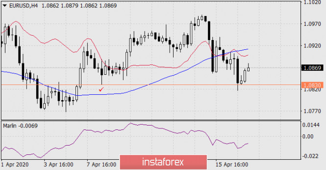 На четырёхчасовом графике цена также под линиями баланса и Крузенштерна, Марлин на территории отрицательной тенденции.