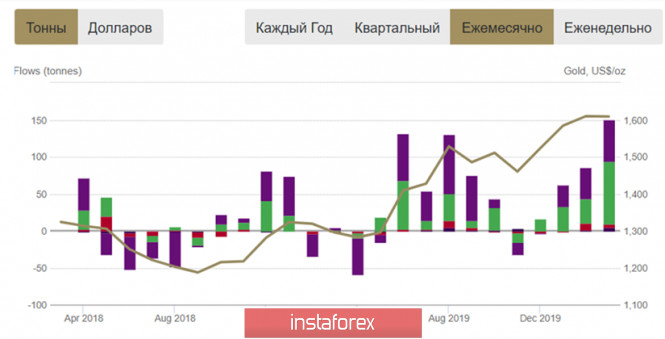 Золотая лихорадка продолжается. Прогноз перспектив золота – GoldИнстаФорекс - Instaforex, 5 лет назад Здравствуйте, уважаемые коллеги. Глобальный маржинкол, вызванный эпидемией COVID-19, закончился массированным вбросом ликвидности в рынки. Денег в систему было закачано столько, что фондовые индексы отскочили на 50% от своего падения, и это несмотря на экономику, функционирующую в половину от своих возможностей, тогда как многие сектора упали до нуля и непонятно, когда восстановятся. Центральные банки изо всех сил стараются поддержать на плаву то, что еще можно спасти, и иногда кажется, что делают они это с излишним рвением. По состоянию на 8 апреля баланс Федеральной Резервной Системы превысил 6 трлн долларов, рост на 2 трлн произошел всего за полтора месяца, что является абсолютным мировым рекордом со времен Веймарской Германии. При этом правительства стран так называемого «золотого миллиарда» очень хорошо усвоили правило сформулированное Маргарет Тетчер: «Как показывает история Веймарской республики в Германии, ничто не подрывает общество сильнее, чем разорение людей в результате потери сбережений». Правительству России, устраивающему своим гражданам обнуление накоплений с периодичностью каждые 5-6 лет, также не мешало бы прислушаться к этим словам «железной леди», но сегодня не об этом, а о золоте и его перспективах. Инвесторы по всему миру сейчас находятся в сложнейшей ситуации, когда падение ставок в ключевых валютах до нулевых значений привело к отсутствию активов, в которые можно было бы вложить капитал и сделать это с прогнозируемыми рисками. Единственным активом, обеспечивающим сохранность и приумножение средств, сегодня и от начала существования человека является золото, и инвесторы в случае опасности активно вкладывают деньги именно в него. При этом золото на долгосрочной дистанции обеспечивает инвесторов 8-процентным приростом на капитал в долларах США ежегодно. Золото наряду с государственными казначейскими облигациями традиционно является активом-убежищем, но в облигациях доходности после снижения ставок сильно упали. Государственные облигации России с погашением в 2028 году и Китая с погашением в 2039 году сейчас приносят доход в долларах всего около 3% годовых, все остальные облигации развитых стран дают максимум 1.5%. Отчет Всемирного Совета Золота по инвестициям биржевых торговых фондов в I квартале текущего года показал рекордный рост вложений, на 298 тонн (рис.1), такого еще не было в истории наблюдений никогда. Особенно усердствовали инвесторы из США, прибавившие в закрома 83.7 тонны, Великобритании - +37.1 тонны, Германии - +20.5 тонн и Швейцарии, добавившие 19.4 тонны драгоценного металла. Как видим, инвесторы из развитых стран, предчувствуя инфляцию и не имея перспективных активов для инвестиций, всем остальным вложениям предпочитают золото, и делают это в контексте стратегии «покупай и держи». Причем доверие к фондам, инвестирующим в так называемое «бумажное золото», у них довольно большое. Однако трейдеры, торгующие золотом в терминалах компании InstaForex, совершив неверную сделку с использованием кредитного плеча, имея при этом неограниченный потенциал прибыли, могут столкнуться со значительными потерями, что подчеркивает необходимость неукоснительного соблюдения правил управления капиталом. Рис.1: Ежемесячные п
