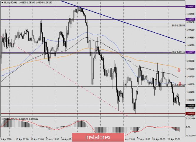 Обзор и прогноз по EUR/USD на 21 апреля 2020 годаИнстаФорекс - Instaforex, 5 лет назад Инвесторы предпочитают уходить в тихие гавани Здравствуйте, уважаемые коллеги! Сегодняшний обзор по валютной паре евро/доллар вновь приходится начинать с темы коронавируса. В европейских странах ситуация с распространением COVID-19 и смертностью от пандемии неоднозначная. Например, в Италии с Испанией суточная смертность снижается. В то же время количество летальных исходов от нового типа коронавируса в Италии за сутки составило 454 человек. Хоть это и меньше, чем ещё, скажем, неделю тому назад, всё равно цифра смертей за одни сутки достаточно велика. Во Франции дела обстоят хуже, но и очаг эпидемии туда пришёл позже. Так, число жертв от COVID-19 за последние сутки возросло до 547 человек, при этом во Франции насчитывается летальных исходов 20 260 с момента начала эпидемии коронавируса. Канцлер Германии Ангела Меркель выразила надежду, что пандемия пошла на спад, но это не может служить аргументом для того, чтобы расслабляться и пренебрегать необходимыми мерами предосторожности. Такое заявление канцлер ФРГ сделала в первый день послабления карантинных мероприятий. На другом конце света, в Соединённых Штатах Америки, ситуация с суточной смертностью от COVID-19 также начала несколько улучшаться, но до стабилизации обстановки ещё далеко. Именно в такой риторике высказался президент США Дональд Трамп, по мнению которого, стране предстоит пережить ещё 2-3 очень сложные недели. Ситуация на мировых торговых площадках в целом продолжает оставаться напряжённой. Аппетита к риску не наблюдается, инвесторы предпочитают уходить в тихие гавани. На этом фоне цены на нефть упали до 25 долларов за баррель, а фондовый рынок завершил торги в красной зоне. Давайте посмотрим, как складывается техническая картина по главной валютной паре рынка Forex, но для начала обозначу те немногие макроэкономические релизы, которые будут опубликованы сегодня. Еврозона и Германия представят на суд участников рынка индекс настроений в деловой среде от института ZEW, который будет опубликован в 12:00 (мск). Из Соединённых Штатов сегодня в 17:00 (мск) придут отчёты по продажам жилья на вторичном рынке. На этом, пожалуй, всё. Daily По итогам вчерашних торгов пара eur/usd немного снизилась. При этом попытки роста и преодоления линии Тенкан индикатора Ишимоку завершились на 1.0896, то есть непосредственно перед очередной встречей с важным и сильным уровнем 1.0900. Сегодня на момент написания обзора евро/доллар снижается, демонстрируя намерения ещё раз протестировать уровень поддержки 1.0811. Если этот уровень будет пробит, и пара завершит сегодняшние торги ниже 1.0800, следующей целью продавцов станет сильная техническая зона поддержки 1.0777-1.0767. Всё будет зависеть от динамики торгов, возможно, медведи пойдут на прорыв обозначенной зоны уже сегодня. Для быков крайне важно будет перейти линию Тенкан и закрыть торги не только выше неё, но и над важным уровнем 1.0900. Впрочем, как хорошо видно на графике, на 1.0913 проходит уровень сопротивления и находится линия Киджун, которые в состоянии оказать сильное сопротивление и развернуть котировку вниз. Н1 На часовом графике евро/доллар торгуется под используемыми скользящими средними: 50 МА, 89 ЕМА и 200 ЕМА, каждая из которых может оказать серьёзное сопротивление попыткам роста. Учитывая техническ