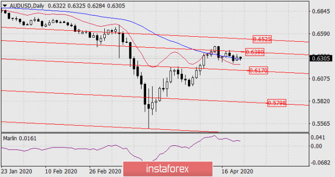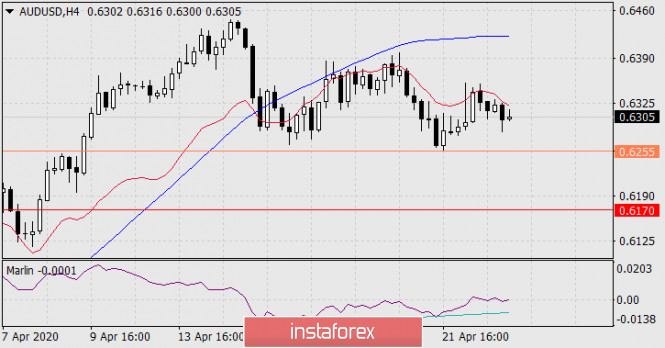 Преодоление ценой сигнального уровня 0.6255 станет надёжным условием среднесрочного понижения с целью 0.5798 и ниже. На графике Н4 ситуация понижающаяся – цена под адаптивной линией баланса (красная). Осциллятор Марлин может развернуться от границы с территорией роста. Не сильная конвергенция по Марлину может оказаться уже отработанной.