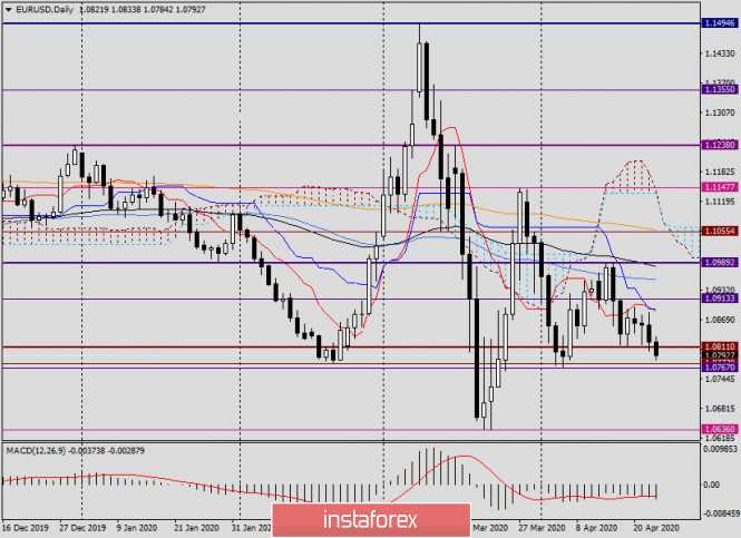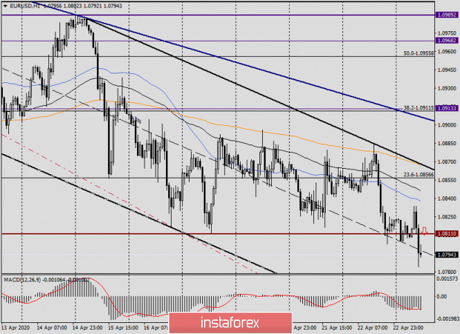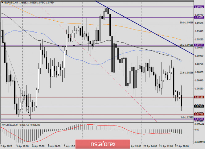 Анализ и торговые рекомендации по EUR/USD на 23 апреля 2020 годаИнстаФорекс - Instaforex, 5 лет назад Здравствуйте, уважаемые трейдеры! По итогам вчерашних торгов доллар США укрепился по отношению к евро. Поддержку американской валюте оказали рост доходности государственных облигаций Соединённых Штатов, а также укрепление индекса доллара. Не стоит забывать, что в условиях эпидемии COVID-19 доллар США зачастую приобретает статус защитного актива. Если заглянуть в экономический календарь, то сегодня в 11:00 (мск) ожидается публикация индекса деловой активности в производственном секторе и секторе услуг еврозоны. Из Соединённых Штатов аналогичные отчёты будут опубликованы в 16:45 (мск), а перед этим в 15:30 выйдут данные по первичным обращениям за пособием по безработице. Завершит сегодняшнюю американскую статистику, в 17:00 (мск) релиз по продажам нового жилья. В нынешних условиях сложно предположить, обратят ли внимание на макроэкономические показатели участники рынка или нет. Как и предполагалось ранее, основное внимание инвесторов обращено к мерам, предпринимаемым правительствами стран по противодействию негативного влияния COVID-19. Пока же прогнозы специалистов относительно перспектив европейской экономики неутешительные. Многие эксперты считают, что экономика еврозоны уже вошла в рецессию, которая может стать самой масштабной. Всему виной карантинные меры и ограничения, связанные с разгулом коронавируса в европейских странах. Прогнозируется, что в первом квартале этого года в еврозоне ожидается спад экономики в районе 3%, а в текущем квартале экономика валютного блока недосчитается ни много ни мало 9.5%. Поистине - шокирующие цифры! Daily Если перейти к рассмотрению технической картины по главной валютной паре рынка Forex, то вчерашние рекомендации продавать eur/usd после кратковременных подъёмов к 1.0874, 1.10892, 1.0903 и 1.0917 в целом оказались правильными. На торгах 22 апреля котировка поднималась к 1.0884, после чего снизилась, и сессия завершилась на уровне 1.0822. Вчерашние попытки медведей продавить знаковый уровень 1.0800 не принесли желаемого результата. Зато сегодня, в моменте написания данной статьи, это важный уровень пробивается и торги ведутся вблизи 1.0792. Как хорошо видно на графике, немного ниже проходит важная зона поддержки 1.0777-1.0767, поэтому продавать на подходе к этим ценам достаточно рискованное позиционирование. Давайте посмотри на ситуацию, которая складывается на более мелких временных промежутках, где сразу постараюсь обозначить торговые рекомендации по EUR/USD. H4 Глядя на это таймфрейм, наблюдаем усиление давления на единую валюту. Естественно, что в такой ситуации очень хочется открыть по eur/usd короткие позиции. Однако вновь подчеркну, что пара направляется в сильную зону поддержки 1.0777-1.0767, откуда может произойти отскок вверх, а то и вовсе разворот курса. Если текущая свеча сформируется с полным медвежьим телом, без длинной нижней тени, ждём отката примерно к его середине, после чего пробуем продать. Судя по 4-часовому графику, это будет ценовая зона 1.0802-1.0811. Н1 На часовом графике пара торгуется ниже используемых скользящих средних (50 МА, 89 ЕМА и 200 ЕМА), которые опаздывают в своём снижении вслед за ценой, и в этом основной минус данных индикаторов. Впрочем, надо признать, что текущее снижение носит довольно резкий характер, поэтому отставание мувин