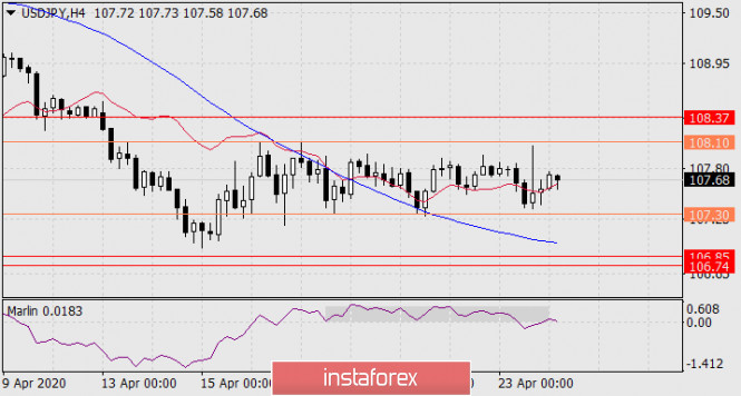 На четырёхчасовом графике цена движется в боковом тренде, в диапазоне неопределённости 107.30-108.10. Первым признаком импульсного движения вниз в ближайшее время, возможно уже сегодня, стал выход сигнальной линии Марлина из собственного диапазоне вниз, причём в зону отрицательных значений.
