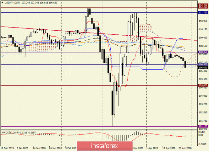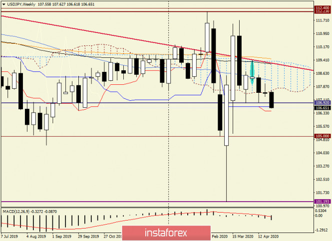 Анализ и прогноз по USD/JPY на 28 апреля 2020 годаИнстаФорекс - Instaforex, 5 лет назад Доброго времени суток, уважаемые трейдеры! Если заглянуть в экономический календарь, то мы увидим, что вчера было опубликовано решение Банка Японии по основной процентной ставке, которая сохранилась на уровне минус 0.10%. Кроме этого, японский регулятор опубликовал доклад о перспективах национальной экономики и инфляции. Немного позднее состоялась пресс-конференция японского Центробанка. Вполне естественно, что основное внимание в Банке Японии было уделено опасениям негативного влияния COVID-19 на экономику страны Восходящего Солнца. В связи с этим совет банка решил увеличить объём покупок ценных бумаг и облигаций до 20 триллионов иен. Кроме этого, в банке решили, что доходность десятилетних гособлигаций Японии останется вблизи нулевого уровня. Прогнозы по экономическому росту и инфляции перетерпели значительные понижения и составили, соответственно, минус 3-5% и минус 0.3-0.7%. Японская экономика, как и все другие ведущие мировые экономики, оказалась подвержена существенным негативным последствиям эпидемии нового типа коронавируса. Глава Банка Японии Харухико Курода высказался за значительное расширение кредитно-денежного стимулирования и пообещал осуществлять скупку облигаций в неограниченном количестве, без всяких лимитов. Сегодня утром поступили данные по безработице в Японии, которые совпали с прогнозами и вышли на уровне 2.5%. Как ожидается, в апреле ситуация значительно ухудшится, а безработных станет гораздо больше. В последующие месяцы уровень безработицы может подскочить до 4%. Посмотрим, как на обозначенные выше события отреагировала валютная пара USD/JPY, но сначала проанализируем итоги прошлой недели. Weekly Несмотря на длинную нижнюю тень позапрошлой свечи, попытки быков по инструменту поднять котировку встретили сильное сопротивление на значимом техническом уровне 108.00. Именно отсюда произошёл отскок вниз, и торги 20-24 апреля завершились на отметке 107.47. При этом у последней свечи сформировалась гораздо более длинная верхняя тень, что стало основанием для реализации медвежьего сценария. И действительно, на момент написания доллар/иена пребывает под давлением продаж и торгуется вблизи ещё одного важного уровня 107.00. Пара вплотную подбирается к уровню поддержки 106.92, пробой которого усилит медвежьи настроения. Также стоит обратить внимание, что usd/jpy вышла вниз из облака индикатора Ишимоку, но облако недельное, а до закрытия торгов ещё предостаточно времени. Полагаю, что основное влияние на пару окажут события завтрашнего дня, когда ФРС обнародует своё решение по процентным ставкам, а председатель Федрезерва Джером Пауэлл проведёт пресс-конференцию. В случае продолжения нисходящей динамики, ближайшими целями станут 106.71 и 106.45, где находятся линии Киджун и Тенкан соответственно. Вернёт паре бычий настрой прорыв ценовой зоны 108.05-108.23, где отмечены максимумы предыдущих недельных торгов и проходит 50 простая скользящая средняя. Daily На дневном графике, после неспособности быков по usd/jpy преодолеть отметку 108.05, наблюдается классический разворот в южном направлении, в ходе которого цена может вывалится вниз из дневного облака индикатора Ишимоку. Если так и произойдёт, позиции игроков на понижение курса значительно усилятся, и в дальнейшей перспект