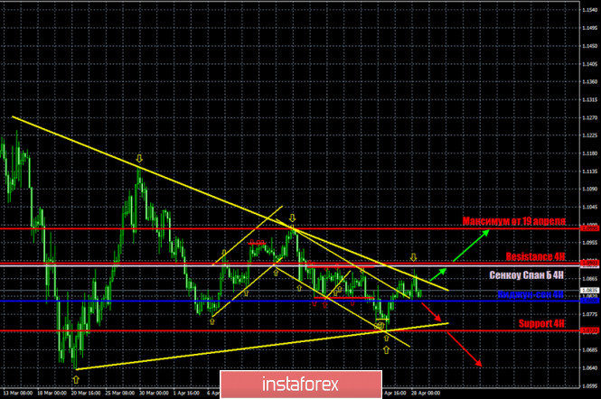 Горящий прогноз и торговые сигналы по паре EUR/USD на 29 апреляИнстаФорекс - Instaforex, 5 лет назад EUR/USD 4H. На 4-часовом графике пара евро/доллар 29 апреля торгуется между двумя сильными линиями тренда. Они изображены на графике как две желтые, наиболее длительные по времени линии противоположного направления. У каждой из линий имеется как минимум две точки опоры. И последняя точка опоры для нисходящей линии тренда была сформирована вчера. Котировки пары EUR/USD отскочили от нисходящей линии тренда, чем показали неготовность трейдеров к дальнейшим покупкам европейской валюты. Таким образом, теперь мы ожидаем снижения котировок пары к восходящей линии тренда. Этот вариант является основным на сегодняшний день. Но не помешает ли ему макроэкономический фон? Как мы уже говорили в фундаментальных статьях, на сегодняшний день запланировано достаточно большое количество различных отчетов, в основном в США. Однако внимание трейдеров может обратить на себя лишь отчет по ВВП. Да и то не факт, что трейдеры уже готовы вновь отрабатывать макроэкономическую статистику. В любом случае если фактическое значение совпадет с прогнозным или будет не слишком сильно отличаться от него (прогнозируемый диапазон ВВП США в первом квартале -4,0% -4,6% г/г), то шансов на реакцию трейдеров будет немного. Участники валютного рынка попросту уже готовы к такому снижению ВВП, можно сказать, что оно уже заложено в котировках пары. Более того, первые два торговых дня недели доллар США находился под давлением рынка и лишь вчера начал рост благодаря техническим факторам. Поздно вечером состоится заседание ФРС, и тут никто не может заранее сказать, какова будет риторика ее председателя Джерома Пауэлла и какие будут приняты решения американским регулятором. Ключевая ставка, скорее всего, останется без изменений, а вот новые программы кредитования или стимулирования экономики исключать нельзя. Также трейдеры ждут от ФРС прогнозов по ключевым показателями экономики на 2020-2021 годы и срокам периода низких ставок и возможного восстановления экономики. Чем «голубинее» будет риторика и действия ФРС, тем больше вероятность падения доллара. Однако мы рассчитываем до вечера закрыть все открытые позиции, чтобы не рисковать понапрасну. Исходя из всего вышесказанного, мы имеем две торговых идеи на 29 апреля: 1) Первое условие для возобновления нисходящего движения уже выполнено. Котировки пары отскочили от нисходящей линии тренда. Таким образом, продавать пару можно уже сейчас с уровнем Stop Loss выше этой самой линии тренда. Также можно дождаться закрытия на часовом графике под линией Киджун-сен индикатора Ишимоку (1,0808) и торговать на понижение с целью уровень поддержки 1,0733 или чуть выше (восходящая линия тренда). Преодоление уровня 1,0733 позволит оставаться в коротких позициях. Take Profit может составить от 50 до 90 пунктов. 2) Второй вариант – «бычий» – предполагает преодоление нисходящей линии тренда, и в этом случае мы рекомендуем покупать евровалюту с первой целью линия Сенкоу Спан Б индикатора Ишимоку 1,0896, рядом с которой пролегает и первый уровень сопротивления для 4-часового графика – 1,0903. Преодоление этих двух сопротивления позволит оставаться в длинных позициях с целью 1,0990 – максимум от 19 апреля. Фундаментальный фон можно изучить в этой статье и в этой. Материал предоставлен компанией I