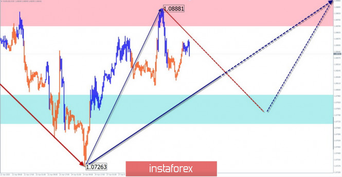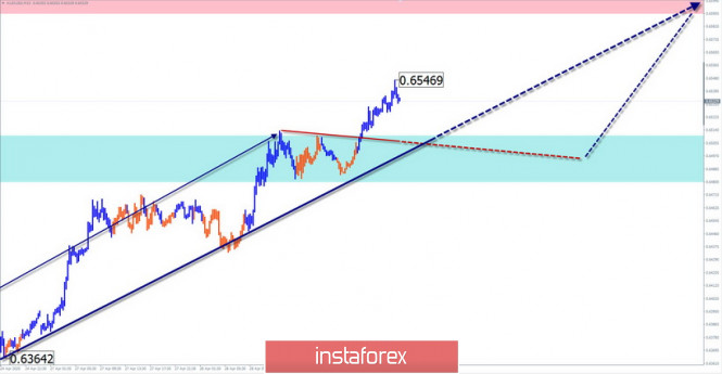 Упрощенный волновой анализ EUR/USD и AUD/USD на 29 апреляИнстаФорекс - Instaforex, 5 лет назад EUR/USD Анализ: Последняя незавершенная на графике евро восходящая волновая конструкция от 20 марта направлена вверх. В ее структуре завершены первые части (А-В). С 24 апреля цена формируется разворотная модель для завершающего рывка вверх. От достигнутой вчера зоны сопротивления цена откатывает вниз. Это снижение стало началом встречной коррекции. Прогноз: На предстоящих торговых сессиях ожидается движения цены в боковом коридоре между встречными зонами. В первой половине дня вероятно завершение начавшегося вчера подъема. Далее ожидается смена курса и повторное снижение. Зоны потенциального разворота Сопротивление: - 1.0870/1.0900 Поддержка: - 1.0800/1.0770 Рекомендации: Торговля на рынке евро сегодня возможна только в рамках интрадея, согласно ожидаемой последовательности. Торговый лот безопасней уменьшить. AUD/USD Анализ: Масштаб начавшегося 19 марта ценового подъема курса австралийского доллара вышел на уровень дневного таймфрейма. Волна имеет явно выраженный импульсный вид движения. Ближайшая остановка возможна в районе расчетного сопротивления. Прогноз: В ближайшие сутки на рынке «аусси» ожидается общий восходящий настрой. В первой половине дня не исключен кратковременный откат вниз, в район расчетной поддержки. На активизацию движений можно рассчитывать к концу дня. Зоны потенциального разворота Сопротивление: - 0.6590/0.6620 Поддержка: - 0.6510/0.6480 Рекомендации: Продажи пары идут против доминирующей тенденции, поэтому не рекомендуются. Основе внимание предлагается уделить поиску на конце встречных откатов сигналов входа в длинные позиции. Пояснения: В упрощенном волновом анализе (УВА) волны состоят из 3 частей (А-В-С). Анализируется последняя незавершенная волна. Сплошным фоном стрелок показана сформированная структура, пунктирным - ожидаемые движения. Внимание: Волновой алгоритм не учитывает продолжительность движений инструмента по времени! Материал предоставлен компанией InstaForex - www.instaforex.com |