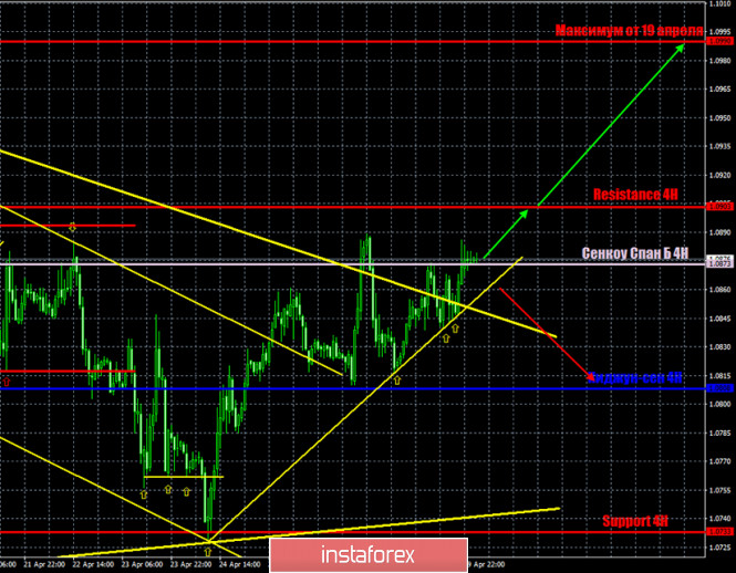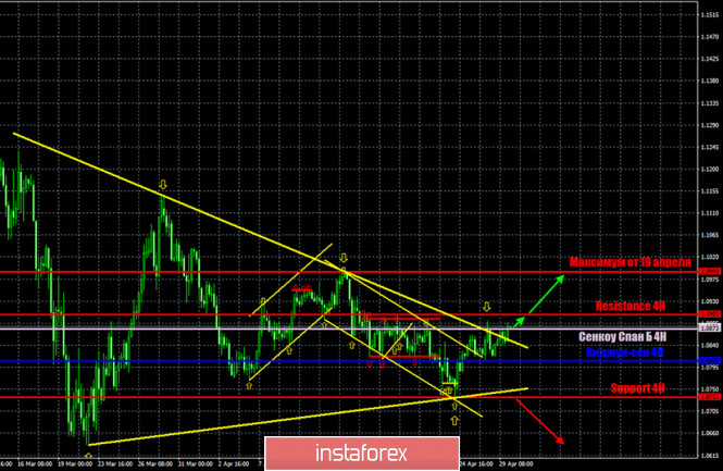Горящий прогноз и торговые сигналы по паре EUR/USD на 30 апреля.ИнстаФорекс - Instaforex, 5 лет назад EUR/USD 4H. На 4-часовом таймфрейме пара евро/доллар 30 апреля преодолела долгосрочную нисходящую линию тренда. Преодолела ее максимально неуверенно, максимально осторожно. Тем не менее, это преодоление дало трейдерам возможность торговать на повышение более уверенно. Мы надеялись, что сильный макроэкономический фон среды поспособствует сильному движению. Однако на практике вышло так, что уровень волатильности совершенно не изменился. Да и вообще мало, что изменилось. Таким образом, мы считаем, что сейчас сформировалась восходящая тенденция по паре евро/доллар. EUR/USD 1H. На часовом таймфрейме, помимо преодоления долгосрочной нисходящей линии тренда, сформирована новая восходящая линия тренда, по 4 точкам опоры. Также трейдерам удалось закрепиться выше линии Сенкоу Спан Б, хоть закрепление это и максимально неуверенное. Таким образом, в краткосрочном плане восходящая тенденция подтверждена техническим анализом. Как мы уже говорили в фундаментальных обзорах, на сегодняшний день вновь запланировано достаточно большое количество различных отчетов и событий, и из Евросоюза, и из Штатов. Однако внимание трейдеров могут обратить на себя лишь некоторые из них. В первую очередь, это, конечно, данные по ВВП Еврозоны за первый квартал и подведение итогов заседания ЕЦБ. Во вторую очередь, это отчет по заявкам на пособия по безработице в США. Однако, взглянув на реакцию участников рынка на вчерашние, не менее важные, события, становится понятно, что, скорее всего, трейдеры будут игнорировать фундаментальный фон и сегодня, 30 апреля. Американская валюта может продолжать находится под умеренным давлением рынка благодаря тому факту, что из-за океана поступает большее количество разочаровывающей макроэкономической статистики. Следовательно, больше оснований для того, чтобы предполагать серьезное сокращение экономики США. Однако, в Евросоюзе ситуация ничуть не лучше и сегодня мы можем убедиться в этом. Также не следует забывать про фактор «веры рынка в доллар», который практически в любой момент может привести к новым сильным покупкам американской валюты. Таким образом, в первую очередь, сейчас по-прежнему рекомендуется обращать внимание на технические факторы, а не на «фундамент». Исходя из всего вышесказанного мы имеем две торговых идеи на 30 апреля: 1) Первое условие для продолжения восходящего движения выполнено. Нисходящая линия тренда преодолена. Таким образом, мы рекомендуем сегодня торговать на повышение с целью максимум от 19 апреля – 1,0990. Мы считаем, что с текущих позиций пара может устремиться вниз, так как ранее уже несколько раз отскакивала от области сопротивления 1,0890 – 1,0900. Таким образом, еще одним условием открытия длинных позиций является закрепление котировок над уровнем сопротивления 1,0903. Потенциальный Take Profit в этом случае составляет 85 пунктов. 2) Второй вариант – «медвежий» - предполагает преодоление новой восходящей линии тренда и в этом случае мы рекомендуем продавать евровалюту с первой целью линия Киджун-сен индикатора Ишимоку 1,0808. Также может быть идентифицирован отскок от области 1,0890 – 1,0990, что также будет являться сигналом к продажам. Потенциальная Take Profit при исполнении этого сценария составит 45 пунктов. Фундаментальный ф