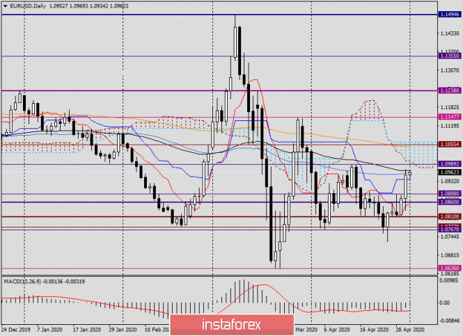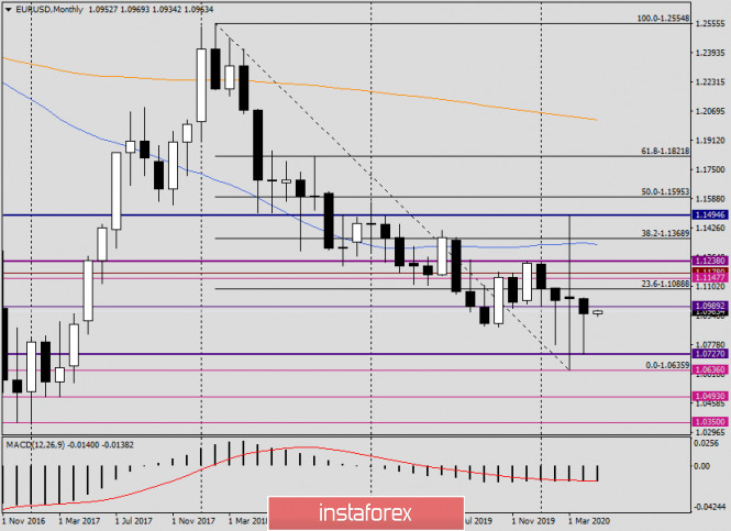 Анализ и прогноз по EUR/USD на 1 мая 2020 годаИнстаФорекс - Instaforex, 5 лет назад Здравствуйте, уважаемые коллеги! За всеми событиями, связанными с решениями крупнейших мировых Центробанков относительно своей денежно-кредитной политики, как совсем позабылось, что вчера рынок закрывал очередной месяц. К итогам апрельских торгов мы обязательно вернёмся, но сначала о вчерашнем решении ЕЦБ и пресс-конференции Кристин Лагард. Как и предполагалось, Европейский Центральный Банк (ЕЦБ) не внёс изменений в параметры своей денежно-кредитной политики и сохранил ключевую процентную ставку на нулевом уровне. Основное внимание участников рынка было обращено на выступление председателя европейского Центробанка Кристин Лагард. По мнению главы ЕЦБ, экономический спад в еврозоне в этом году может составить от 5 до 12 процентов. Естественно, что причиной этому эпидемия COVID-19 и неопределённость восстановления экономической активности после завершения пандемии. В связи с негативными последствиями коронавируса, ЕЦБ продолжит масштабное кредитование компаний. В банке готовы к принятию новых мер, в случае начала второй волны нового типа коронавирусной инфекции. Относительно ставок прозвучала традиционная формулировка о том, что они останутся на текущих низких значениях, пока инфляция не подойдёт к целевому уровню 2%. Да и в условиях негативного влияния COVID-19 на экономику региона рассчитывать на ужесточение монетарной политики не приходится. Вот, пожалуй, и всё. Ничего экстраординарного объявлено не было, и это ожидалось подавляющим большинством инвесторов. Сегодня новостной фон для главной валютной пары фактически будет отсутствовать. Разве что можно выделить производственный индекс института управления поставками (ISM), который Соединённые Штаты опубликуют в 17:00 (мск). Таким образом, логично предположить, что последний торговый день недели будет определяться воздействием технических факторов, а также корректировкой позиций перед выходными. Monthly После мартовской свечи с огромными верхней и нижней тенями, по итогам апрельских торгов появилась свеча с особенно длинной нижней тенью. Минимальные значения в прошлом месяце были показаны на 1.0727, а цена закрытия оказалась на уровне 1.0952. Глядя на две последние месячные свечи, можно прийти к выводу, что рынок не желает снижаться и вести торги ниже важной отметки 1.0700. Все попытки медведей продавить этот уровень и закрепиться под ним не увенчались успехом. Более того, в ходе апрельских торгов пара даже не коснулась 1.0700. Раз рынок не желает снижаться, с большой долей вероятности можно предположить, что в этом месяце мы увидим рост eur/usd. Наиболее оптимальной целью предполагаемого укрепления выглядит ценовая зона 1.1100-1.1150. Daily В ходе вчерашних торгов главная валютная пара продемонстрировала достаточно неплохой рост, в результате которого были достигнутые обозначенные ранее цели 1.0957, 1.0966. Это те уровни, на которых находятся 50 простая и 89 экспоненциальная скользящие средние. Именно здесь, как и предполагалось, котировка встретила сильное сопротивление и восходящее движение приостановилось. Впрочем, нельзя исключать, что по евро/доллару сохранится позитивный настрой и сегодня подъём продолжится. По крайней мере, быкам по инструменту необходимо проходить вверх 50 МА с 89 ЕМА и закрывать торги выше. Только после эт