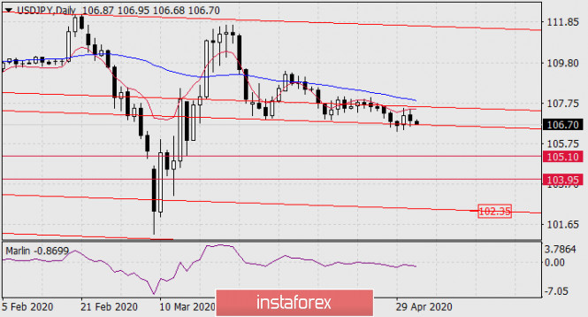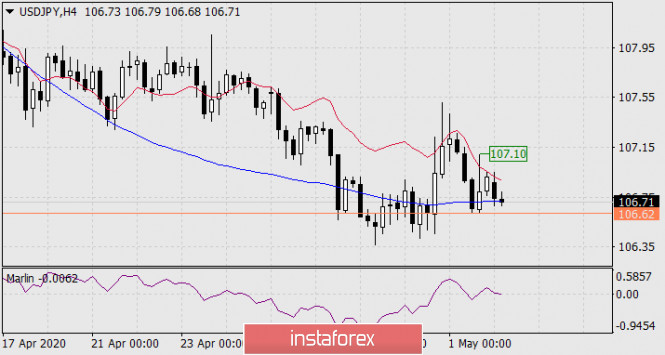 Прогноз по USD/JPY на 4 мая 2020 годаИнстаФорекс - Instaforex, 5 лет назад USD/JPY Сегодня в азиатскую сессию цена вновь пытается преодолеть эту поддержку. Успех позволит цене снизиться до первой цели 105.10. Индикатор Марлин на территории отрицательной (понижающейся) тенденции.