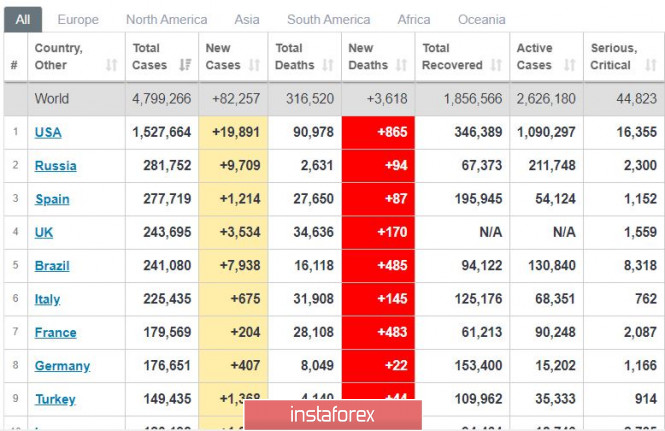 Дневник трейдера 18.05.2020. Коронавирус в России: резкое улучшение. РубльИнстаФорекс - Instaforex, 5 лет назад Это график суточного прироста новых случаев коронавируса в Москве. Последний справа столбик +3200 случаев. В максимуме почти +7000. Мы видим резкое падение новых случаев - это говорит о прохождении пика эпидемии. Нагрузка на медицину начнет снижаться после 3 июня - когда начнут массово выздоравливать люди, госпитализированные в первые дни мая, в момент максимума эпидемии. По России картина не столь хороша, но тоже стабилизация Это график суточного прироста новых случаев по России на 18 мая Большие споры, на уровне мирового скандала, возникли в последнюю неделю из-за необъяснимо низкой смертности от коронавируса в России. Точнее, речь идет о летальности - какой процент от зараженных умирает. В среднем по миру это 6%. В наиболее пострадавших Испании и Италии - более 10%. В очень благополучной Германии 4%. В России на 18 мая - 1%. Вряд ли мы можем рассчитывать на то, что наша медицина эффективнее немецкой в 4 раза. Однако выводы по летальности в России можно будет делать, когда число новых случаев в России упадет ниже +2000 в сутки, а в Москве ниже +1500 в сутки. Вы можете сами сравнить число смертей по странам и соотношение числа зараженных и смертей (Total Deaths)в таблице выше. Рубль держится на максимумах к доллару и евро - с конца марта. Причина крепости рубля - при сильном негативе и по нефти и по экономике - относительное укрепление цен на нефть (Брент выше 30 долл) и интервенции ЦБ. Есть такое предположение, что ЦБ будет удерживать курс рубля от падения до голосования по поправкам в Конституцию России - это намечено на 24 июня, по неофициальной информации. Стратегически я не вижу крепкого рубля - и текущие цены весьма привлекательны для покупки доллара и евро на перспективу до конца года. |