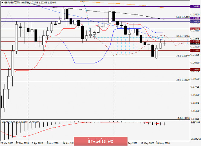 Анализ и прогноз по GBP/USD на 20 мая 2020 годаИнстаФорекс - Instaforex, 5 лет назад Доброго времени суток, уважаемые трейдеры! Как вчера и предполагалось в обзоре по GBP/USD, пара не смогла преодолеть сопротивление продавцов в районе 1.2270-1.2288. Немного позже вернёмся к более подробному рассмотрению графиков валютной пары фунт/доллар, а пока коротко о макроэкономических показателях и событиях, которые уже вышли и ещё ожидаются. Сегодня в 09:00 (мск) из Великобритании поступили важные макроэкономические отчёты по потребительским ценам. Индекс потребительских цен в Великобритании вышел хуже прогнозов экспертов, что могло усилить ожидания участников рынка о введении Банком Англии отрицательных процентных ставок. Естественно, негативные инфляционные показатели и слухи об отрицательной ставке не могли оказать поддержку британской валюте. И не оказали. Daily Как уже отмечалось в начале статьи, пара gbp/usd не смогла преодолеть сопротивление в зоне 1.2270-1.2288 и, откатившись, завершила торги 19 мая на отметке 1.2248. Препятствиями для продвижения котировки вверх, как и ожидалось, стали линия Тенкан индикатора Ишимоку и 50 простая скользящая средняя. После выхода слабых данных по инфляции в Великобритании фунт стерлингов попал под умеренное давление, однако на данный момент пара понемногу восстанавливается, торгуясь вблизи 1.2247. Как представляется, немалую роль в таком развитии событий играет текущая слабость американской валюты после весьма пространных заявлений председателя Федеральной Резервной Системы (ФРС) США Джерома Пауэлла. Напомню, что, выступая перед американским Конгрессом, глава Федрезерва сделал неутешительные заявления относительно падения ВВП на 20-30% во втором квартале и роста уровня безработицы выше 20%. Что мы имеем на данный момент. Ближайшее сопротивление представлено вчерашними максимумами на 1.2294, в случае переписи которых паре придётся столкнуться с ещё одним сильным сопротивлением продавцов в области 1.2305-1.2357, где находятся обе границы дневного облака Ишимоку, а выше проходит линия Киджун. Ещё раз выражу своё личное мнение, что только пробой Киджун и закрепление над уровнем 1.2360 откроет дорогу к более высоким целям. Пока же быки по паре не могут преодолеть сопротивление Тенкан и 50 МА, которое расположено вблизи 1.2275. Если пара, не сумев пройти вверх данную отметку, развернётся в южном направлении, то целями медведей по фунту станут вчерашние минимумы на 1.2182, после обновления которых будет протестирован на пробой сильный технический уровень 1.2165. Ситуация на дневном таймфрейме крайне неопределённая, поэтому посмотрим, что происходит на более мелких временных промежутках. Н4 На 4-х часах продолжению роста препятствуют 50 МА и 89 ЕМА, которые располагаются в ценовой области 1.2255-1.2295. Рискну предположить, что только пробой 89 ЕМА (1.2295) и закрепление выше важного уровня 1.2300 откроет дорогу к более дальним целям. Следим за свечными сигналами вблизи обозначенных мувингов, и после появления медвежьих моделей пробуем продавать gbp/usd с целями 1.2200, 1.2165 и 1.2100. Если пара сможет пробить 89 экспоненту и закрепиться выше, на откате к 89 ЕМА уже стоит рассматривать покупки. Открытие длинных позиций по более привлекательным ценам рекомендую поискать после кратковременного снижения в ценовую зону 1.2200-1.2165, но и в этом случае лучше увидеть подтверждение в виде бычь