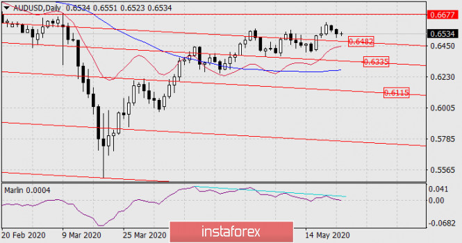 Австралийский доллар продолжает разворот от пика 20 мая, реализуя технический потенциал двойной дивергенции по осциллятору Марлин на графике дневного масштаба. Ближайшей поддержкой выступает вложенная линия ценового канала на отметке 0.6482. Преодоление уровня открывает возможность снижения к следующей линии в район 0.6335. Чуть ниже данной отметки расположена линия Крузенштерна – область второй цели выступает сильной поддержкой.