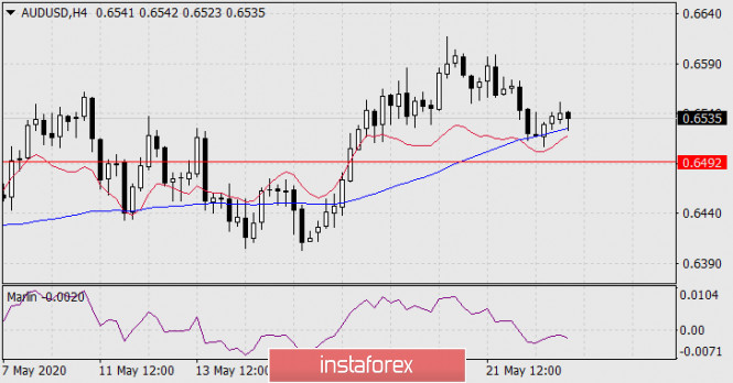 На четырёхчасовом графике цена преодолевает поддержку линии Крузенштерна, осциллятор Марлин снижается в отрицательной области. Ждём продолжение снижения цены, но основное развитие может быть завтра, так как сегодня в США и Великобритании праздничный день.