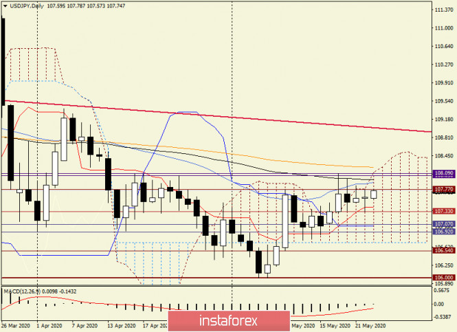 Анализ и торговые идеи по USD/JPY на 25 мая 2020 годаИнстаФорекс - Instaforex, 5 лет назад Здравствуйте! Прошлую торговую неделю валютная пара USD/JPY завершила укреплением. Однако длинная верхняя тень последней свечи и неочевидное закрытие в пределах облака индикатора Ишимоку не позволяют с уверенностью говорить о дальнейшем росте котировки. Заседание Банка Японии, которое состоялось на прошлой неделе, оказалось «проходным». О новых мерах объявлено не было, лишь вновь прозвучали заявления о продлении программы кредитования, а меры по стимулированию расширены не были. Как правило, подобные заявления игнорируются участниками рынка, что мы и наблюдали после заявлений японского Центробанка. Напрашивается очевидный вывод о том, что в ближайшей перспективе Банк Японии не будет смягчать свою денежно-кредитную политику и понижать процентные ставки. Учитывая данный фактор, основное внимание инвесторов обращено к технической картине по usd/jpy, к рассмотрению которой предлагаю незамедлительно перейти. Weekly Как уже отмечалось в самом начале статьи, последняя свеча, учитывая её длинную верхнюю тень, вышла далеко не однозначной. Пара по-прежнему крутится вокруг сильного технического уровня 107.77, чуть ниже которого проходит линия Тенкан индикатора Ишимоку. По сути, торги проходят между двумя сильными техническими уровнями 107.00 и 108.00. Сами посудите, максимумы прошлой недели оказались на 108.09, а минимальные значения торгов 18-22 мая были показаны на уровне 107.07. Полагаю, что истинный пробой одной из этих отметок может определить последующую направленность данного инструмента. При этом пробой сопротивления продавцов на 108.09 представляется более проблематичным, потому что уже на 108.13 быки по usd/jpy могут столкнуться с трудностями в виде 50 простой скользящей средней, которая, без сомнения, постарается не пустить котировку выше. Впрочем, и прорыв поддержки на 107.07 не даст однозначного ответа о нисходящем сценарии по доллар/иене. Немного ниже, на 106.92, проходит сильный технический уровень, линия Киджун находится на 106.71, а на 106.54 отмечены минимальные значения позапрошлых недельных торгов. По моему мнению, именно наличие над 108.09 и под 107.07 обозначенных сильных преград создаёт неопределённость и препятствует принятию решения о дальнейшем направлении цены. Рискну предположить, что для выбора чётко обозначенного направления паре понадобится серьёзный драйвер. Daily В моменте завершения данного обзора доллар/иена торгуется с небольшим укреплением вблизи 107.73. Вполне вероятно, что объёмы сегодняшних торгов будут незначительными по причине государственных праздников и закрытия финансовых площадок в Великобритании и США. По технической картине можно отметить следующие нюансы. Пара торгуется в пределах дневного облака Ишимоку, которое само по себе считается зоной неопределённости. Выходу вверх могут препятствовать 50 простая и 89 экспоненциальная скользящие средние, над которыми проходит уровень сопротивления продавцов 108.09. Впрочем, и это ещё не всё. Уже на 108.21 пару может встретить серьёзное сопротивление, которое способна оказать оранжевая 144 экспоненциальная скользящая средняя. Внизу поддержку оказывает линия Тенкан, под которой проходит уровень 107.33. Более дальние поддержки уже обозначались при описании недельного графика. Вывод и торговые рекомендации по USD/JPY С