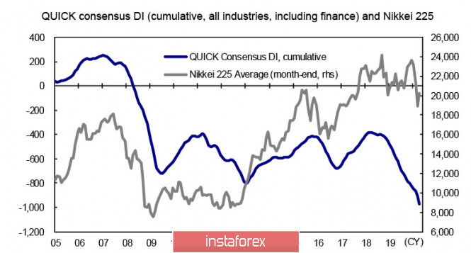 Завершение пандемии никак не поможет реальной экономике. Обзор CAD и JPYИнстаФорекс - Instaforex, 5 лет назад Понедельник – выходной день для банков США и Великобритании, к тому же не предполагается публикаций макроэкономических данных, что, вероятнее всего, приведет к снижению активности и торговле в диапазоне. Пандемия коронавируса свою роль выполнила – теперь есть на что списывать надвигающуюся рецессию. USDCAD Объём розничных продаж в Канаде в марте упал впервые за 5 месяцев, падение составило 10%, является максимальным за всю историю наблюдений и выше чем в США. Было закрыто около 40% предприятий розничной торговли, и даже рост интернет-торговли не смог компенсировать падение. Отчет CFTC оказался негативным, чистая короткая позиция выросла на 224 млн долл., до 2,514 млрд, уровень справедливой цены, учитывающий, кроме данных CFTC, состояние фондового рынка и спред доходностей, изменился мало и имеет слабую отрицательную динамику. Текущий уровень справедливой цены немного выше спота, что дает импульс к росту, однако он блокируется общим направлением расчетной цены вниз. В совокупности позиция остается нейтральной, а это значит, что факторы, способствующие выходу луни из диапазона, все еще не сложились. Канадский доллар продолжает находиться в очень сильной зависимости от спроса на риск, практически не реагируя на внутренние данные, и пойдет вслед за рынком в случае появления сильного драйвера. Пока же поддержка 1,3845/65 остается актуальной, верхняя граница диапазона немного смещается вниз и находится в зоне 1.4050/70. Направления нет, актуальна диапазонная торговля. Вечером ожидается выступление главы Банка Канады Полоза, которое может дать дополнительные ориентиры. USDJPY Банк Японии в пятницу провел экстренное заседание по вопросам монетарной политики, на котором была достигнута договоренность о запуске программы беспроцентных займов для малого бизнеса. По итогам заседания с совместным заявлением выступили министр финансов Асо Таро и глава Банка Японии Курода, что само по себе является очень редким событием. В заявлении говорится, что правительство и Банк Японии будут координировать усилия с целью оказать поддержку бизнесу и финансовому рынку. Для чего понадобился такой неординарный шаг? Вероятно, глубина падения экономики во 2 квартале может оказаться сильнее, чем прогнозировалось до текущего момента. Сравнение индикатора QUICK Consensus DI (который отслеживает пересмотры прогнозов аналитиков фондового рынка, работающего в исследовательских центрах) с динамикой Nikkei 225 показывает, что текущий уровень фондового индекса явно завышен. Конечно, главная причина силы фондового рынка заключается в том, что Банк Японии продолжает покупать ETF. Продолжающееся использование государственных денег для поддержания цен на акции обеспечивает краткосрочную стабильность для внутренней экономики, но в долгосрочной перспективе приводит к отрыву от реальной экономики, что в итоге скажется на позиции инвесторов. При этом отношение рыночной капитализации первой секции TOKYO STOCK EXCHANGE к номинальному ВВП упало ниже 100% впервые за 14 месяцев. Индекс TSE служит ориентиром для финансового сектора экономики, и его снижение может быть подсказкой относительно дальнейших действий Банка Японии и правительства. Выравнивание ситуации к рыночной реальности предполагает либо ре