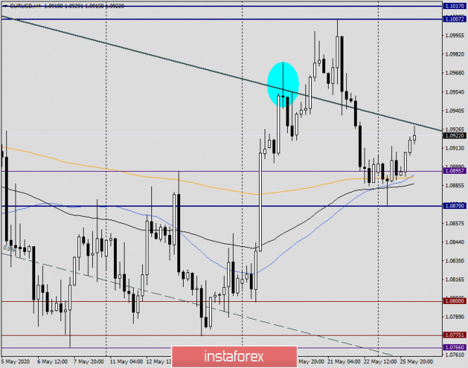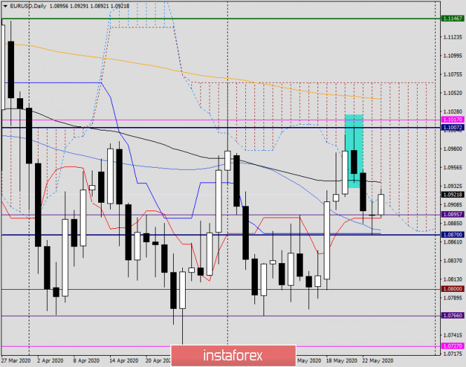 Анализ и прогноз по EUR/USD на 26 мая 2020 годаИнстаФорекс - Instaforex, 5 лет назад Здравствуйте, уважаемые коллеги! Прежде чем перейти к рассмотрению графиков главной валютной пары, немного о внешнем фоне и фундаментальной составляющей. Пандемия COVID-19 безусловно нанесла ущерб мировой экономике, в том числе и экономической активности в развитых странах. Вчерашние данные из Германии показали снижение инвестиций в основной капитал на 6.9%, частное потребление упало на 3.2%, а экспорт снизился на 3.1%. Что касается немецкого ВВП, то показатель вышел в рамках ожиданий и сократился в первом квартале на 2.2%. Это самое сильное сокращение ВВП Германии с момента финансово-экономического кризиса 2008-2009 годов. Если апеллировать сухими цифрами, то вчерашний индикатор оценки текущей ситуации от IFO вышел хуже ожиданий 80.0 и по факту составил 78.9. Впрочем, индикатор условий деловой среды, а также индикатор экономических ожиданий от IFO оказались лучше прогнозов. Тем не менее большинство экономистов считает, что в первом квартале этого непростого года экономика ФРГ оказалась в рецессии. В этом нет ничего удивительного, ведь карантин, вызванный эпидемией коронавируса, и закрытие подавляющего большинства предприятий парализовали экономическую активность. Однако постепенно карантинные ограничения снимаются, и привычный ритм жизни в большинстве европейских стран налаживается. Например, Испания и Греция постепенно открывают пляжи и ждут туристов. Конечно, всё это делается очень осторожно, ведь полностью расслабляться не стоит, тем более на фоне прогнозов о вероятности второй волны COVID-19 в сентябре-октябре текущего года. В Соединённых Штатах Америки свои проблемы, главная из которых - это Китай. Поднебесная не даёт покоя администрации 45-го президента США Дональда Трампа, который при каждом удобном случае высказывает в адрес Пекина очередные упрёки и претензии. Напомню, что в нынешней ситуации США фактически обвиняют Китай в распространении по миру COVID-19 и нанесению значительного ущерба американской экономике. До пандемии ведущая мировая экономика была безусловным козырем для переизбрания Трампа на второй президентский срок, но теперь ситуация существенно изменилась. Сегодня в 16:00 (мск) ожидаются отчёты из США по рынку жилья, а в 17:00 (мск) будет опубликован индикатор потребительской уверенности, который прогнозируется на уровне 87.1. Daily Если перейти к рассмотрению технической картины по главной валютной паре рынка Forex, то вчерашний день можно назвать типичным понедельником. Это означает раскачку рынка перед последующими движениями, что и показала вчерашняя свеча дожи, у которой вовсе отсутствует тело. То есть, там где рынок открылся, там же произошло и закрытие дневной сессии. Ожидаемую поддержку евро/доллару оказали линии Тенкан и Киджун индикатора Ишимоку, а также 50 простая скользящая средняя. Сегодня в моменте написания данной статьи eur/usd укрепляется. Главной задачей для евробыков станет завершение сегодняшних торгов в пределах облака Ишимоку и выше 89 экспоненциальной скользящей средней, которая проходит на 1.0938. При выполнении этих условий можно ожидать дальнейшего подъёма курса в район 1.1000-1.1043, где выше важного психологического уровня проходит оранжевая 200 экспонента. Однако для большей уверенности в дальнейшей реализации бычьего сценария необходим 