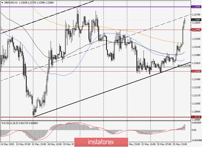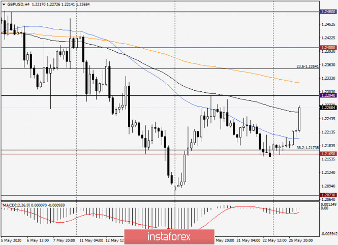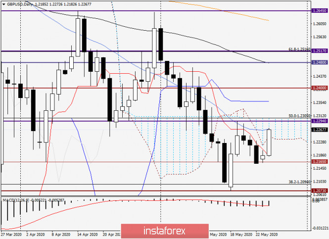 Анализ и прогноз по GBP/USD на 26 мая 2020 годаИнстаФорекс - Instaforex, 5 лет назад Доброго времени суток, уважаемые трейдеры! Прежде чем подробно разобрать техническую картину по валютной паре GBP/USD, хотелось бы отметить, что в Великобритании раздули целый политический скандал. Дело в том, что Доминик Каммингс, который является главным советником британского премьер-министра Бориса Джонсона, в самый разгар эпидемии COVID-19 нарушил режим карантина. Каммингс повёз своего пятилетнего сынишку к его дедушке и бабушке, то есть к своим родителям. Основаниями для такого поступка стали якобы появляющиеся симптомы коронавируса у самого Каммингса и его супруги. В целях безопасности ребёнка главный советник Джонсона и решил отвезти сына к родителям. Пикантность ситуации в том, что сам Доминик Каммингс жёстко выступал за введение в Великобритании карантина. Теперь в отношении действий чиновника начато официальное расследование. В то время как британская общественность возмущена поступком Каммингса, премьер-министр Борис Джонсон заявил, что это были отцовские чувства его советника, но и негодование британцев ему понятно. Из сегодняшних событий, которые способны повлиять на ценовую динамику пары фунт/доллар, хотелось бы отметить выступление члена Комитета по монетарной политике Банка Англии Энди Халдейна, которое состоится в 12:00 (мск), данные по рынку жилья США, которые запланированы к публикации на 16:00 (мск), а также индикатор потребительской уверенности американцев в 17:00 (мск). Daily Нисходящий сценарий, о котором говорилось во вчерашнем обзоре по gbp/usd, пока не находит своего подтверждения. Поддержка на 1.2165 оказалась достаточно сильной, чтобы удержать котировку от снижения. В результате вчерашних торгов на дневном графике появилась маленькая бычья свечечка, причём оказалась она внутри тела предыдущей медвежьей свечи. По сути, это свечная модель «Харами», после появления которой часто наблюдается укрепление курса, что на момент написания данной статьи и происходит. Сейчас пара фунт/доллар торгуется с повышением вблизи 1.2270 и тестирует на пробой 50-простую скользящую среднюю. Если пыл быков по фунту не иссякнет и котировка продолжит подъём, ближайшей целью на дневном таймфрейме станут верхняя граница облака индикатора Ишимоку на 1.2294 и значимая отметка 1.2300. Полагаю, что задачей минимум для игроков на повышение курса станет закрытие дневной сессии над 50 МА. Если же быкам по gbp/usd удастся завершить торги выше 1.2300, оснований для дальнейшего укрепления котировки станет ещё больше. В этом случае, как уже отмечалось накануне, следующей целью вверху будет линия Киджун, которая проходит на 1.2357. Если быки растеряют текущий рост и у сегодняшней появится длинная верхняя тень, а цена закрытия окажется вне пределов облака Ишимоку, дальнейшие восходящие перспективы будут весьма проблематичны. Н4 После открытия сегодняшних торгов пара прошла вверх 50 МА, и в моменте пробивает чёрную 89 экспоненту. Судя по сильной восходящей динамике, фунт стерлингов, скорее всего, продолжит укрепление, в ходе которого протестирует на пробой уровень сопротивления 1.2294 и отметку 1.2300. Для потенциальных покупок на этом графике хороших вариантов не вижу. Разве что откат к пробитой 50 МА, в район 1.2200. Впрочем, такой значительный откат может стать уже сменой направления, поэтому лучше пока н