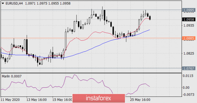 На четырёхчасовом графике цена также выше индикаторных линий и Марлин в зоне роста. Закрепление цены над 1.0995 станет условием для роста к 1.1140. Восстановление понижающегося настроения произойдёт после снижения цены под сигнальный уровень 1.0885.