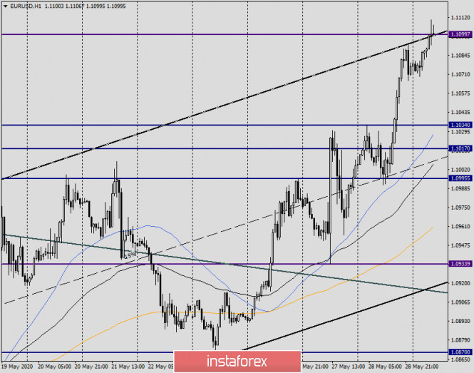 Денёк сегодня необычный. Анализ и прогноз по EUR/USD на 29 мая 2020 годаИнстаФорекс - Instaforex, 5 лет назад Неплохо устроились Здравствуйте, уважаемые коллеги! Daily На вчерашних торгах главная валютная пара рынка Forex продемонстрировала достаточно мощный рост. Евробыкам удалось выполнить задачу максимум - пробить уровень 1.1065 и вывести котировку вверх из дневного облака Ишимоку. Возможно, этому поспособствовала смешанная макроэкономическая статистика из Соединённых Штатов Америки, однако, на мой взгляд, негатива в ней оказалось больше. Вопреки прогнозам (минус 4.8%), изменение объема ВВП за первый квартал составило минус 5%. Это крайне важный и показательный момент относительно последствий COVID-19, которые уже сказываются и которые ещё предстоит пережить ведущей мирровой экономике. Что касается самой пандемии, то её очаг находится в Бразилии и США. При этом Соединённые Штаты удерживают первое место по числу погибших от коронавируса, которое уже превысило 100 тысяч. Теперь о безработице в США. Несмотря на то что рост числа безработных немного снизился, цифра всё равно просто невероятная. Только вдумайтесь, за первичными пособиями по безработице на прошлой неделе обратились 2 миллиона 123 тысячи человек! В этой связи многие эксперты утверждают, что кризис может затянуться на достаточно длительное время, а планы по восстановлению экономики находятся под угрозой. По безработице наблюдается крайне любопытная ситуация. С одной стороны, работодатели для сокращения расходов не могут себе позволить нанимать или содержать своих работников. С другой стороны, американцы, получающие пособие по безработице, не спешат находить работу, так как еженедельное федеральное пособие зачастую оказывается больше потенциальной заработной платы. Такие пособия предусмотрены до 31 июля, и в американском Конгрессе идут напряжённые дебаты - стоит ли продлевать срок их действия. На данный момент, по отчётам Министерства труда Соединённых Штатов, в стране насчитывается 41 миллион безработных, половина из которых сидит на пособии. Неплохо, правда?! Такая жизнь многих устраивает. Зачем работать, когда получаешь пособие, как правило, превышающее заработок? В общем, неплохо устроились. Однако давайте вернёмся к технической картине по EUR/USD и проанализируем её. Вчерашнее закрытие торгов на отметке 1.1077 ясно даёт понять, что пара готова к последующему укреплению, ближайшими целями которого станут 1.1100, 1.1145, 1.1175 и 1.1200. Сегодня на момент написания курс уже поднимался к 1.1099, но затем немного откатил, и прямо сейчас евро/доллар торгуется в непосредственной близости от 1.1100. Денёк сегодня необычный. Так называемое «Тройное закрытие», когда рынок будет закрывать майские торги, недельную сессию и сегодняшний день. В такие дни всегда сложно прогнозировать ценовое движение, и совсем необязательно открывать новые позиции, тем более что впереди выходные. В таких ситуациях наиболее вероятными считаются два сценария. Либо на фоне фиксации позиций происходит корректировка, либо рост продолжается и торги закрываются на новых максимальных значениях. Посмотрим, какая картина наблюдается на более младших таймфреймах и можно ли там отыскать точки для входа в рынок. Н1 В моменте завершения обзора пара выходит вверх из восходящего канала и пробивает важную отметку 1.1100. Если над этим уровнем закро