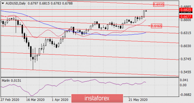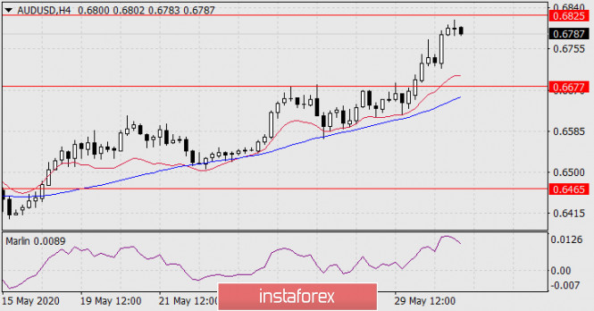 На четырёхчасовом графике сигнальная линия осциллятора Марлин смотрит вниз, но для разворотного признака нужен более весомый паттерн. Возможна консолидация цены (около суток) под уровнем 0.6825, после чего ждём продолжение роста к 0.6935.