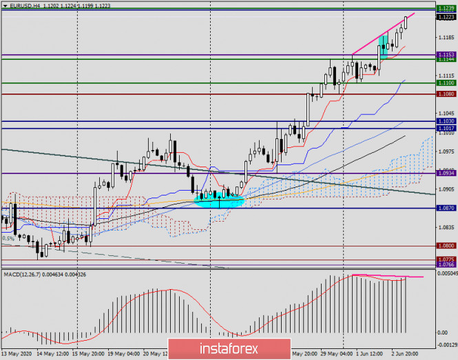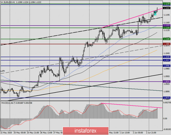 Анализ и прогноз по EUR/USD на 3 июня 2020 годаИнстаФорекс - Instaforex, 5 лет назад На рынке сохраняется аппетит к риску Здравствуйте, уважаемые коллеги! Готовность котировки продолжить движение в северном направлении в ходе вчерашних торгов в полной мере подтвердилась. Более того, сегодня утром евро/доллар продолжает своё восхождение и торгуется уже вблизи 1.1207. Тем не менее не всё так однозначно, как может показаться с первого взгляда. Что касается главных событий этой недели, то они ещё впереди, и участникам рынка придётся на них каким-то образом реагировать. Напомню, что в четверг Европейский Центральный Банк (ЕЦБ) объявит о своём решении по процентным ставкам, а немного позже состоится пресс-конференция президента ЕЦБ Кристин Лагард. В последний день недельных торгов выйдут отчёты по рынку труда США, которые могут существенно повлиять на итоги текущей торговой пятидневки. Относительно заседания ЕЦБ сохраняются ожидания, что европейский Центробанк может объявить о дополнительных стимулирующих мерах для восстановления экономической активности в странах еврозоны. Напомню, что для экстренной помощи европейской экономике от негативных последствий пандемии COVID-19, Еврокомиссия предложила принять масштабный пакет стимулирующих мер, размером 1.85 триллионов евро. В свою очередь, ЕЦБ может увеличить экстренную скупку ценных бумаг, которая сейчас определяется суммой 750 миллиардов евро, ещё на 500 миллиардов. Нет сомнений в том, что такие ожидания оказывают поддержку единой европейской валюте, которая укрепляется по широкому спектру рынка. Полагаю, что события четверга-пятницы станут определяющими для дальнейшей ценовой динамики главной валютной пары рынка Форекс. Что касается доллара США, то американская валюта продолжает испытывать давление, связанное с постепенной нормализацией эпидемиологической ситуации в мире и падением спроса на безопасные активы. Сложно сделать однозначный вывод о прямой связи ослабления USD с событиями в Миннесоте, а также поведением президента США Дональда Трампа в отношении гонконгского вопроса. Скорее всего, основное давление на доллар оказывает продолжающийся аппетит к риску и оптимистические настроения на глобальных торговых площадках. Daily На дневном графике, казалось бы, всё хорошо. Пара продолжает уверенный рост и поднимается всё выше и выше. Однако хотелось бы отметить, что ценовая зона 1.1200-1.1235 очень сильна и не раз оказывала cильное влияние на ценовую динамику eur/usd. Посмотрим, как на этот раз поведёт себя цена в обозначенной области. В случае появления здесь медвежьей свечной модели, высока вероятность, если не разворота и смены текущего восходящего тренда, то корректировки курса, целями которой может стать район цен 1.1150-1.1100. Н4 А вот на 4-часовом графике просматривается перекупленность пары, на которую указывает медвежья дивергенция индикатора MACD. Если на этом графике появится разворотная модель свечного анализа или комбинация медвежьих свечей, стоит рассматривать открытие коротких позиций с ближайшими целями в районе 1.1165-1.1145. Более дальним ориентиром для потенциальных продаж будет область 1.1130-1.1100. Н1 На часовом графике также наблюдается медвежья дивергенция MACD. В таких случаях, когда на нескольких таймфреймах появляется дивергенция, шансы на её отработку значительно возрастают. В то же врем
