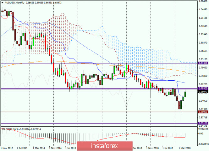 Обзор и прогноз по AUD/USD на 3 июня 2020 годаИнстаФорекс - Instaforex, 5 лет назад COVID-19, будь он неладен! Доброго времени суток, уважаемые трейдеры! Вчера, 2 июня, Резервный Банк Австралии (РБА) огласил свой вердикт по процентной ставке. По итогам заседания было принято решение не вносить изменений в параметры денежно-кредитной политики и сохранить основную процентную ставку на уровне 0.25%. В банке полагают, что принятых мер вполне достаточно для поддержания австралийской экономики от последствий COVID-19. Наполню, что австралийский Центробанк активно скупает гособлигации, объём покупок которых, по последним данным, составляет 50 миллиардов долларов США. При этом в РБА заявили, что в случае необходимости объём покупок ценных бумаг может быть увеличен. Не исключено и принятие дополнительных мер для достижения инфляционных целей, а также для подъёма уровня занятости. На данный период времени в РБА обеспокоены снижением расходов домохозяйств и резким увеличением количества безработных в связи с введением мер карантина и закрытием многих предприятий малого и среднего бизнеса. Как заявили в банке, такой сложной экономической ситуации не было с 1930 года. Экономистами австралийского Центробанка прогнозируется падение ВВП в первом квартале текущего года на 0.4%, в то время как предыдущий показатель, за 4 квартал прошлого года, показал рост на 0.5%. Ничего не поделаешь - COVID-19, будь он неладен! Ну что же, давайте разберём техническую картину, которая складывается по валютной паре AUD/USD, и начнём с итогов недавно завершившегося месяца. Monthly Анализируя месячный таймфрейм, сразу бросается в глаза мартовская свеча с чрезвычайно длинной нижней тенью и минимумами на 0.5510. Как правило, такие здоровенные хвосты ясно дают понять, что рынок достиг дна и отказывается от дальнейшего снижения. Именно это мы и наблюдали в апреле, по итогам которого появилась свеча «Бычье поглощение». Да, поглощение можно считать не очень-то убедительным, так как открытие апрельских торгов произошло там же, где закрылся март. Зато закрыли апрель значительно выше, чем произошло открытие торгов предыдущего месяца. В мае подъём пары продолжился, правда, он был не таким внушительным, как месяцем ранее. Пара достигла линию Киджун индикатора Ишимоку и завершила последний весенний месяц вблизи неё. Начало лета будто вдохнуло новые свежие силы в быков по «оззи». Впечатляющий рост за неполные три торговых дня говорит о хорошем дальнейшем потенциале для игроков на повышение курса. Сейчас aud/usd торгуется вблизи 0.6900, однако настоящие испытания для быков по «австралийцу» начнутся в сильной и важной ценовой зоне 0.7000-0.7032. Во-первых, здесь проходит знаковый психологический и технический уровень 0.7000. Во-вторых, в этом районе показаны максимальные значения декабрьских торгов прошлого года и января текущего. В-третьих, это зона проторговки, которая не раз влияла на изменение ценовой динамики данной валютной пары. В общем, тем, кто стоит в покупках по австралийскому доллару, рекомендую фиксировать прибыль именно в ценовой зоне 0.7000-0.7032. Вполне допускаю, что отсюда произойдёт существенный отскок или корректировка курса. В случае начала второй волны COVID-19 и появления сильного спроса на доллар США, рост «австралийца» может завершиться и пара вновь развернётся в направлении глобального нисходящего тренда. Daily