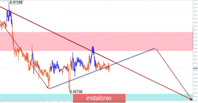 Упрощенный волновой анализ и прогноз GBP/USD, USD/JPY, USD/CHF на 4 июняИнстаФорекс - Instaforex, 5 лет назад GBP/USD Анализ: С 18 марта на графике британского фунта сменился тренд дневного масштаба. В структуре волны прослеживается зигзаг (А-В-С). Последняя часть стартовала 18 мая. К настоящему времени цена приближается к нижней границе предварительной целевой зоны. Со вчерашнего дня на графике развивается откат. Прогноз: На европейской торговой сессии ожидается продолжение ценового снижения, вплоть до его полного завершения. Кратковременный прокол нижней границы поддержки не исключен. Далее ожидается разворот и повторный подъем в район сопротивления. Зоны потенциального разворота Сопротивление: - 1.2590/1.2620 Поддержка: - 1.2500/1.2470 Рекомендации: Продажи на рынке фунта сегодня могут быть рискованны. Лучше снизить лот в этих сделках или воздержаться от торговли. Рекомендуется отслеживать сигналы покупки в районе расчетной поддержки. USD/JPY Анализ: В доминирующей с марта восходящей волне направление краткосрочного тренда задает бычий участок от 6 мая. В начале текущей недели цена продавила сильное сопротивление и вплотную придвинулась к нижней границы предварительной целевой зоны. Прогноз: В первой половине дня не исключен кратковременный откат вниз. Прорыв ниже поддержки маловероятен. Возобновление бычьего курса можно ждать к концу суток либо завтра. Зоны потенциального разворота Сопротивление: - 109.40/109.70 Поддержка: - 108.80/108.50 Рекомендации: Для продажи йены сегодня не созданы условия. В районе расчетной поддержки рекомендуется отслеживать сигналы разворота для входа в длинные позиции. USD/CHF Анализ: В прошедшие 2 месяца направление ценового движения швейцарского франка задавала корректирующая волна в виде горизонтального треугольника. Ее последний участок от 7 мая близится к логическому завершению. Прогноз: Сегодня ожидается общий нисходящий настрой ценового движения. В первой половине дня возможен кратковременный подъем к зоне сопротивления. Активную фазу снижения можно ждать на американской сессии. Зоны потенциального разворота Сопротивление: - 0.9640/0.9670 Поддержка: - 0.9570/0.9540 Рекомендации: Покупки на рынке пары могут быть рискованны и не рекомендуются. В рамках интрадея сегодня возможны продажи. Лот в них лучше уменьшить. Пояснения: В упрощенном волновом анализе (УВА) волны состоят из 3 частей (А-В-С). Анализируется последняя незавершенная волна. Сплошным фоном стрелок показана сформированная структура, пунктирным - ожидаемые движения. Внимание: Волновой алгоритм не учитывает продолжительность движений инструмента по времени! Материал предоставлен компанией InstaForex - www.instaforex.com |