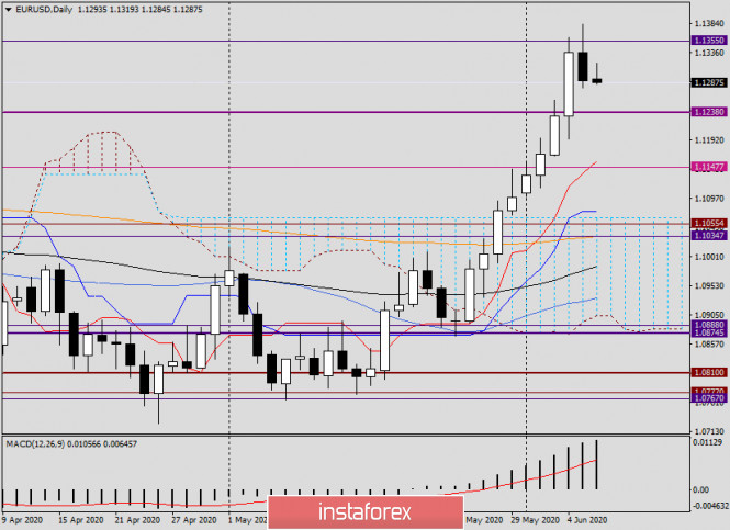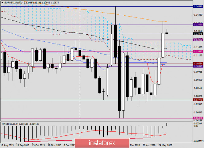 Обзор и прогноз по EUR/USD на 8 июня 2020 годаИнстаФорекс - Instaforex, 5 лет назад Рынок труда США восстанавливается? Здравствуйте, уважаемые коллеги! Ну что же, первая летняя неделя прошла на волне рисковых настроений и завершилась ослаблением доллара США по широкому спектру рынка. На аппетит инвесторов к риску указывает тот факт, что такие валюты-убежища, как швейцарский франк и японская иена, оказались невостребованными и завершили торги потерями против американского доллара. Все другие основные валюты довольно-таки прилично укрепились. Особенно это касается новозеландского и австралийского долларов, что лишь ещё больше подчёркивает рисковые настроения участников рынка. Главная валютная пара рынка EUR/USD закрыла торги 1-5 июня уверенным ростом, прибавив 1.74%. Прежде чем перейти к графикам цены, вспомним о пятничных данных по рынку труда США. По данным Министерства труда Соединённых Штатов Америки, число вновь созданных рабочих мест в несельскохозяйственных секторах экономики (Nofarm Payrolls) увеличилось в мае на 2.509 миллиона. Напомню, что, по прогнозам экономистов, ожидалось дальнейшее снижение занятости на восемь миллионов. Уровень безработицы в США также оказался лучше ожиданий 15% и по факту составил 13.3%. Стоит отметить, что апрельский показатель составил 14.7%. Можно ли предположить, что рынок труда восстанавливается? Скорее всего, по причине возобновления работы предприятий именно так и происходит. Ложкой дёгтя в бочке мёда оказался рост средних почасовых заработных плат, который не оправдал ожиданий (прогноз 1%) и вышел на уровне минус 1%. Впрочем, это показатель всегда был ахиллесовой пятой в трудовых отчетах и не пускал инфляцию к целевому уровню Федеральной Резервной Системы (ФРС) США в 2%. Тем не менее майскую статистику по рынку труда можно считать на удивление сильной. Всё-таки нонфармы и уровень безработицы являются наиглавнейшими показателями американского рынка труда. Впрочем, удивление вызвали не только хорошие показатели по NFP и безработице, но и реакция на них участников рынка. Weekly Поскольку в пятницу закрылись недельные торги, техническую часть данной статьи по традиции начнём с соответствующего таймфрейма. Как хорошо видно на графике, достаточно сильный рост пары остановила 200 экспоненциальная скользящая средняя, которая проходит на 1.13081. Пара протестировала на пробой этот мувинг, однако отскочила от него и завершила недельные торги ниже важного уровня 1.1300, на отметке 1.1289. В немалой степени этому способствовала и хорошая трудовая статистика из Штатов, хотя она, судя по всему, не произвела должного впечатления на инвесторов и, по большому счёту, вновь была проигнорирована. С технической точки зрения негативным моментом можно считать закрытие торгов 1-5 мая ниже значимого уровня 1.1300. А позитивом стал уверенный выход вверх из облака индикатора Ишимоку. Вполне возможно, что участники рынка ещё не до конца осознали факт восстановления рынка труда США и продолжат отыгрывать пятничную статистику. По крайней мере, сохраняется вероятность отката к пробитой верхней границе облака Ишимоку, которая проходит на 1.1224. Окончательно убедит в бычьем сценарии пробой 200 ЕМА и закрытие недельных торгов выше важнейшего психологического и технического уровня 1.1500. Daily Свечу за 5 июня вполне можно считать разворотной. Во-первых, она сформирова