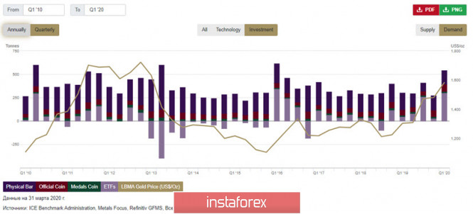 Золото (#Gold), перспективы на июнь-июль 2020 годаИнстаФорекс - Instaforex, 5 лет назад Здравствуйте, уважаемые коллеги. Ровно месяц прошел с момента моей статьи, где я усомнился в возможности продолжения роста цены золота, предположив, что текущая ситуация в позициях трейдеров фьючерсного рынка предполагает как минимум консолидацию и как максимум снижение. Сегодня, когда Комитет по открытым рынкам озвучит свое решение, а председатель ФРС США Джером Пауэлл прокомментирует ситуацию в мировой экономике, я вновь хочу рассмотреть перспективы драгоценного металла в контексте текущей ситуации. Несмотря на то что спрос на золото состоит из потребления ювелирных изделий, технологий, инвестиций и покупок центральных банков, по моему глубокому убеждению, наибольшее влияние на цену драгоценного металла оказывает инвестиционный спрос и позиционирование трейдеров фьючерсного рынка, так называемый ценовой тренд. Почему именно инвестиционный спрос, а не спрос на ювелирные изделия влияет на цену? Однозначного ответа у меня нет, но можно предположить, что основной спрос на ювелирные изделия сосредоточен в Азии - в Индии и Китае, в то время как цена золота номинирована в долларах США. Кроме этого, спрос со стороны ювелирной промышленности растянут во времени и связан с экономическими циклами, в то время как спрос со стороны инвесторов имеет более краткосрочный вектор и подвержен влиянию таких факторов, как альтернативная стоимость, склонность к рискам и предполагаемый прогноз цен. При этом в структуре инвестиционного спроса преобладает спрос со стороны биржевых торговых фондов (ETF), инвестирующих в золото и его производные инструменты (рис.1). Рис.1: Инвестиционный спрос на золото. Из диаграммы 1, динамики золота и инвестиционного спроса, хорошо видно, что инвестиции ETF и цена движутся скоординировано. Растет цена, растет спрос со стороны ETF и наоборот. Чего нельзя сказать, например, о покупках физического и монетарного золота. Однако в этой схеме есть определенные недостатки. Поскольку данные о спросе со стороны биржевых фондов публикуются с опозданием, мы не можем сказать, что первично, - спрос со стороны инвесторов или рост цены под влиянием других факторов приводит к инвестиционному спросу со стороны ETF. Как следует из последних данных опубликованных World Gold Council, в мае инвестиции биржевых торговых фондов составили 154 тонны, или 8.5 млрд долларов. При этом совокупный объем вложений в биржевые торговые фонды достиг нового исторического максимума 3510 тонн, что больше, чем у любой отдельно взятой страны, кроме США (рис.2). Рис.2: Приобретения биржевых фондов ETF и цена золота взаимодействуют между собой Однако с точки зрения оценки краткосрочных перспектив цены, а именно они больше всего интересуют трейдеров, торгующих в терминалах компании InstaForex, наиболее продуктивным и ценным для анализа является Отчет по обязательствам трейдеров - COT Report, публикуемый комиссией по товарным фьючерсам США - CFTC. Где перспективы роста фьючерсной цены золота определяются притоком новых денег на рынок и поведением группы трейдеров под названием Money Manager, также называемых спекулянтами. Биржа COMEX-CME является крупнейшим торговцем фьючерсными контрактами, и именно ее показатели определяют текущий спрос на золото в мире. Причем в последние несколько лет в вопросе определения цен